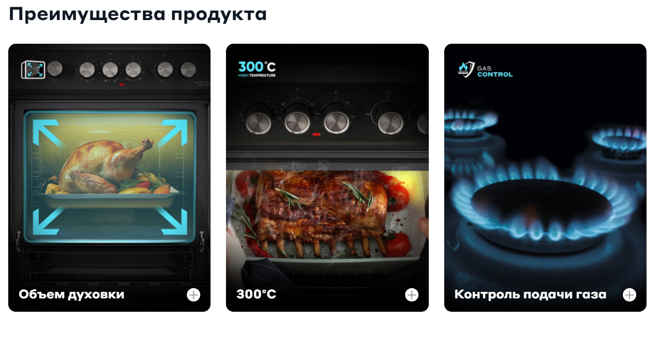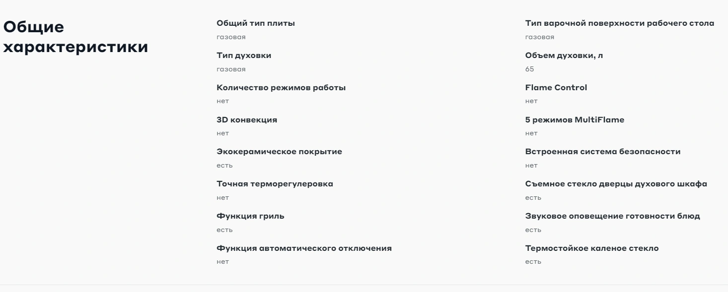 - Газовый контроль: Автоматическая система газ-контроля для безопасности (в случае погасания пламени в духовке или конфорке, подача газа автоматически прекращается).