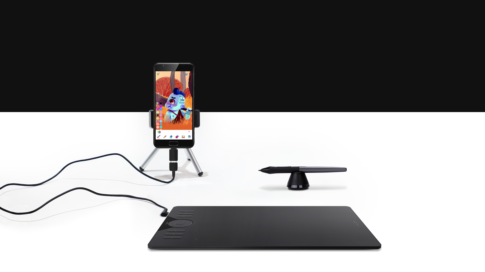 Графический планшет HS610 поддерживает подключение к мобильному телефону через адаптер. Адаптер с технологией OTG и интуитивно понятное управление планшетом позволяют рисовать в любое время и в любом месте.