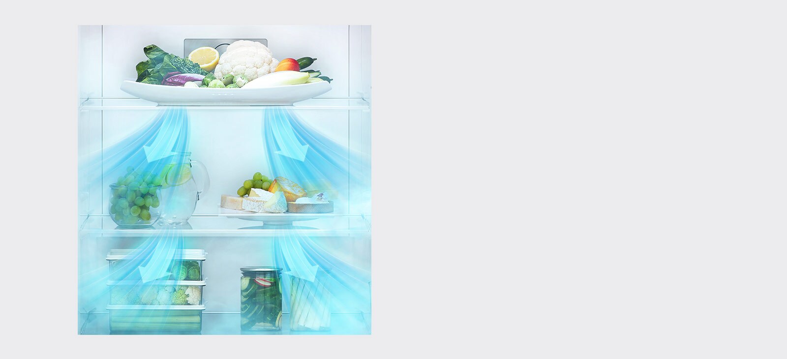Еда остается свежей, напитки становятся ледяными на любой полке благодаря равномерному и быстрому охлаждению.