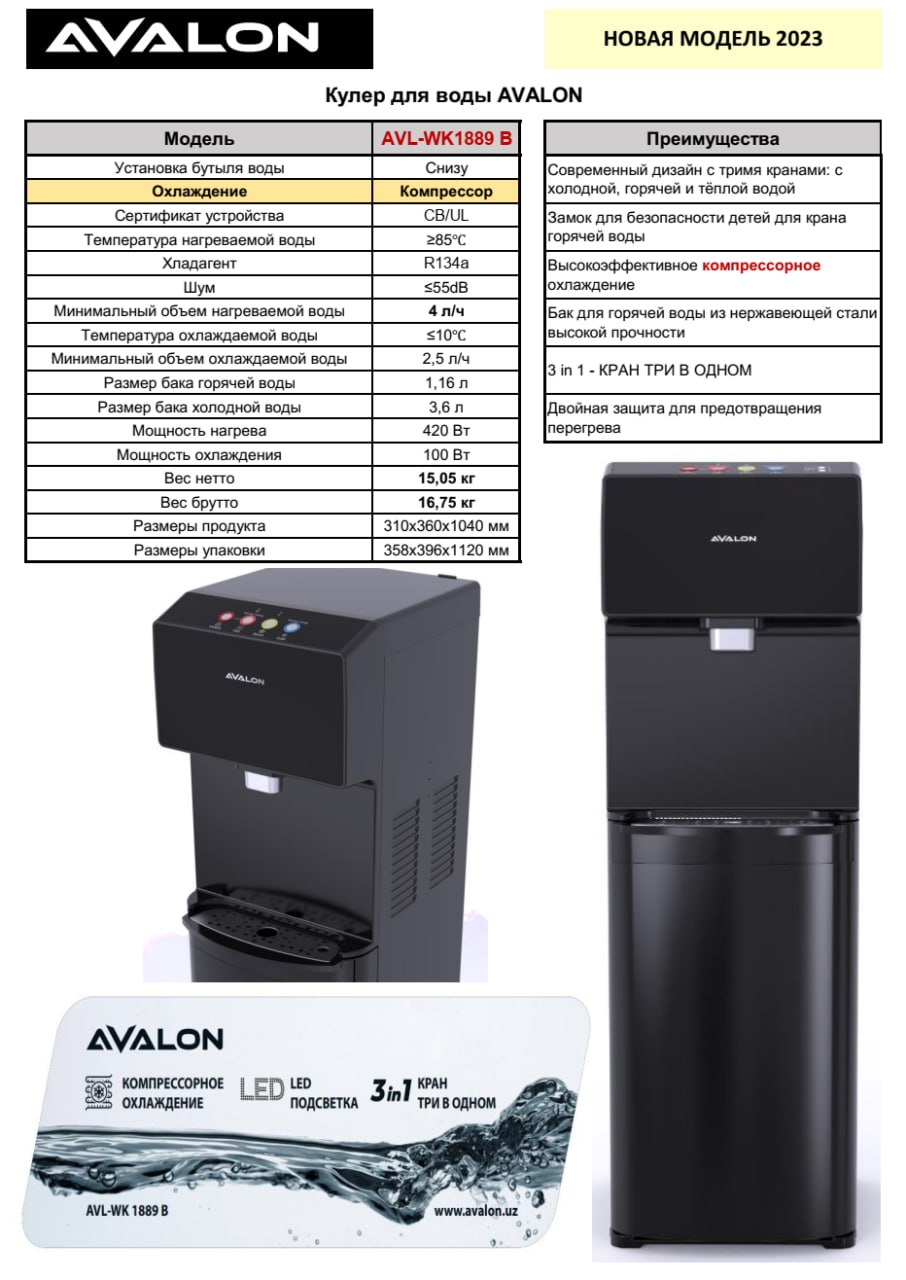 Кулер для воды AVL WK-1889 B – это современный бытовой прибор с инновационной технологией, состоящий из 3 кнопок и 1 крана для подачи холодной, теплой и горячей воды. Имеет защиту в виде облегчения ожогов горячей водой. Кулер для воды для защиты владельца с обеих сторон. Бак для горячей воды изготовлен из высококачественной нержавеющей стали, бак для холодной воды – из штампованной нержавеющей стали.