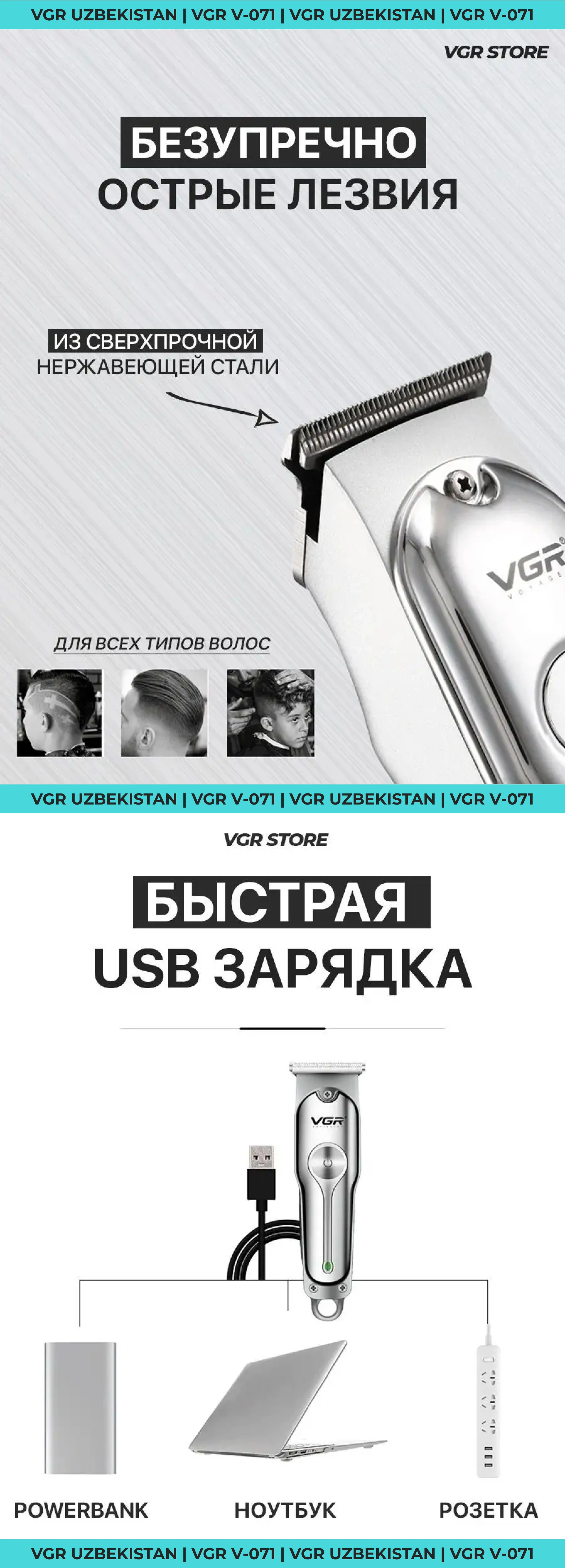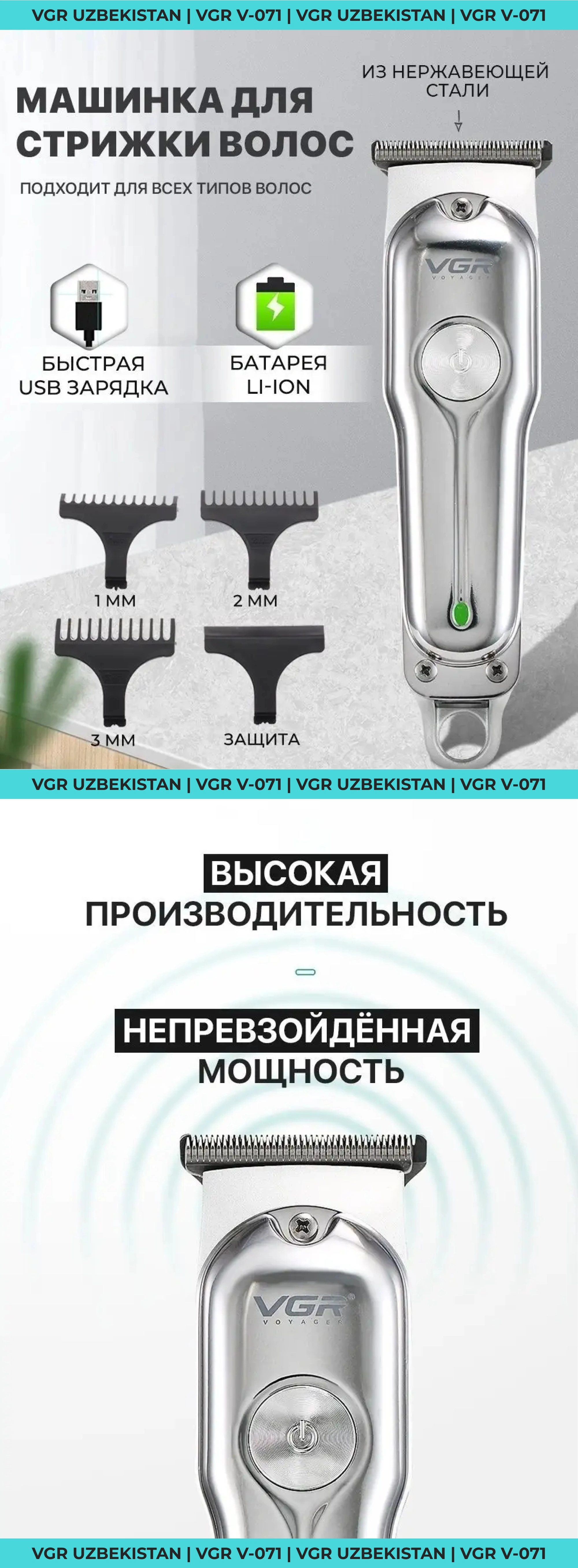 Soch kesish mashinasi 3-si 1-da (erkaklar uchun soch kesish mashinasi) - uchta nozulli universal soch turmagi, soch, soqol, mo'ylovni kesish uchun professional to'plam. VGR V-071 qirqish mashinasi, ishlab chiqaruvchi VGR, chiroyli ixcham dizaynga ega, suv o'tkazmaydigan, bir qismli, zanglamaydigan po'latdan yasalgan metall korpus, metall kulrang rang, past shovqin. Yengil vaznli 5 Vt soqol trimeri. 600 mA/soat batareya quvvatiga ega trimmerlar yangi zaryadda 2 soat ishlaydi. Soqol va moʻylov uchun trimer - tez zaryadlovchi sifatida foydalanish mumkin - USB Tyre-C, MicroUSB kabeli yoki estrodiol tarmoq quvvati va oʻrnatilgan batareya. Shavers va trimmerlar tezlikni almashtirish bilan ishlaydi. Qo'shimchalari bo'lgan soch kesish mashinasi ikkita tezlikni almashtirish tezligi bilan sozlanishi. Trimmer ustara balandligi 14 sm, kengligi 4 sm.Karbonli po'latdan yasalgan o'tkir T shaklidagi pichoqlar. Pichoqning maxsus burchagi terini kesishdan himoya qiladi. Soqol va mo'ylovni kesish moslamasi ixcham va osilgan halqaga ega. Professional soqol trimmerida 3 nasadkalar bor - 1 mm, 2 mm, 3 mm, bu sizga yaxshiroq va aniqroq kesish yoki sochingizni olish imkonini beradi. Professional soch kesish mashinasida tozalash uchun himoya ko'krak, moy, cho'tka mavjud. Mustaqil soch turmagi uchun uyda soqol va bosh trimeridan foydalanish mumkin - ayniqsa boks uchun u kontur va soqolni zargarning aniqligi bilan qirqadi. Bundan tashqari, trimmer soqol va mo'ylovni kesish uchun, bo'lingan uchlari uchun, soch kesish uchun, tana uchun professional uchun javob beradi. Elektr soqol trimmeri tez va aniq go'zallik, qizarish va tirnash xususiyati yo'q. Trimmer barcha turdagi terilar va ohanglar uchun xavfsizdir. Soch kesish vaqtida maksimal qulaylikni ta'minlaydigan professional soch kesish mashinasi, siz uzun sochlarni kesishda simsiz ishlashingiz mumkin, bu juda qulay va ustani noqulay pozitsiyalarni egallashdan qutqaradi. Elektr soqol trimmeri oddiy soch kesish uchun ham, jingalak va batafsil soch turmagi uchun ham ishlatilishi mumkin. O'zingizga bemalol g'amxo'rlik qilish imkonini beruvchi ko'p qirrali, ishonchli va yuqori texnologiyali qaychi. Trimmerga texnik xizmat ko'rsatishning qulayligi maksimal gigiena darajasini ta'minlaydi va qurilmaning ergonomikasi va kichik o'lchamlari uni hatto sayohatlarda ham elektr quvvati etishmasligidan qo'rqmasdan olish imkonini beradi. Universal soch kesish mashinasi oddiy soch kesish uchun ham, jingalak va batafsil soch turmagi uchun ham, bolalar soch turmagi uchun ham ishlatilishi mumkin. Trimmerga texnik xizmat ko'rsatishning qulayligi maksimal darajada gigienani ta'minlaydi va qurilmaning kichik o'lchamlari uni hatto sayohatlarda ham elektr quvvati etishmasligidan qo'rqmasdan olish imkonini beradi. Chiroyli qadoqlash hozirgi quvonchni ikki baravar oshiradi. Erkak, dada, bobo uchun eng yaxshi sovg'a
