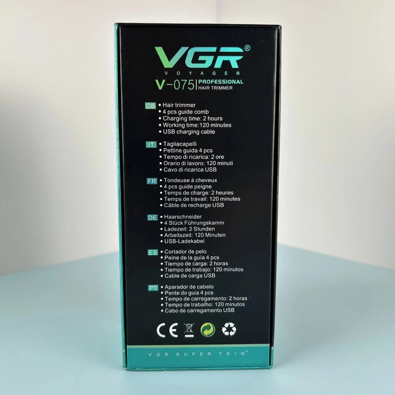 Soqol va soch trimeri VGR V-075 soch, soqolni kesish, shuningdek, modellashtirish uchun mo'ljallangan. Soch kesish mashinasi ham professional, ham uyda foydalanish uchun mo'ljallangan. Soqol olish mashinasi tovushni yutuvchi metall korpusga ega, buning yordamida ustara minimal shovqin va tebranish hosil qiladi. Jihozda uzunlikni sozlash uchun 0,8-3-6-3-9-12 mm bo'lgan 4 ta biriktirma, shuningdek xavfsiz va aniq uslublar uchun to'rtburchak uchi bo'lgan T shaklidagi pichoqlar mavjud.VGR kesish mashinasi qayta zaryadlanuvchi va simsiz bo'lib, uzun shnurga ehtiyoj sezmasdan soqolingizni kesish yoki kesish imkonini beradi. VGR V-075 trimeri 120 daqiqa uzluksiz ishlash va 2 soat zaryadlash uchun sig‘imli 600 mA/soat batareyaga ega. Soch kesish mashinasi pichoqlarning silliq harakatlanishi uchun yuqori samarali 5V 1A = 5 Vt dvigatel bilan jihozlangan. Qulay joylashgan quvvat tugmasi bilan suv o'tkazmaydigan va sachramaydigan dizayn.