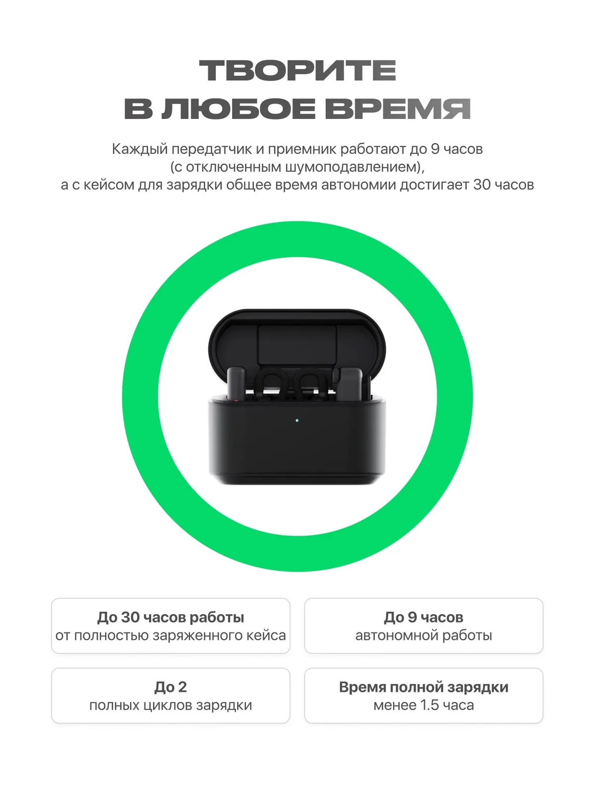 Ilhom uchun energiya Har bir uzatuvchi va qabul qiluvchi 9 soatgacha ishlaydi va zaryadlash qutisi bilan batareyaning umumiy ishlash muddati 30 soatga etadi - ko'p soatlik to'y marafonini yoki hujjatli filmni suratga olish uchun etarli. Type-C mobil qabul qilgichida ulangan smartfonni yozib olish vaqtida to'g'ridan-to'g'ri zaryad qilish uchun o'tish porti mavjud. Endi elektr rozetkasiga bog'lanishning hojati yo'q - kun bo'yi yarating!