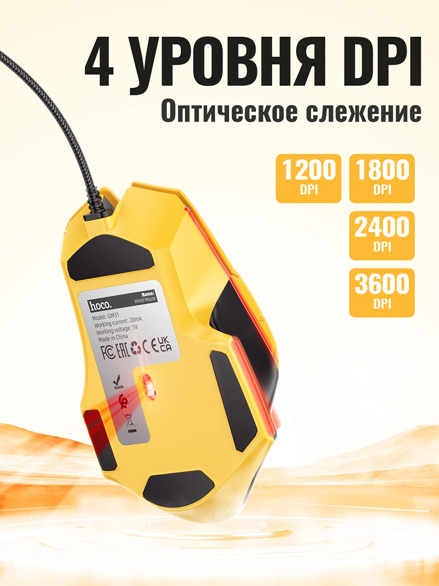 4. DPI diapazoni: Hoco GM31 1200/1800/2400/3600 DPI darajalarini qo‘llab-quvvatlaydi, bu sichqonchani har qanday o‘yin yoki ish uchun moslashtirish imkonini beradi.