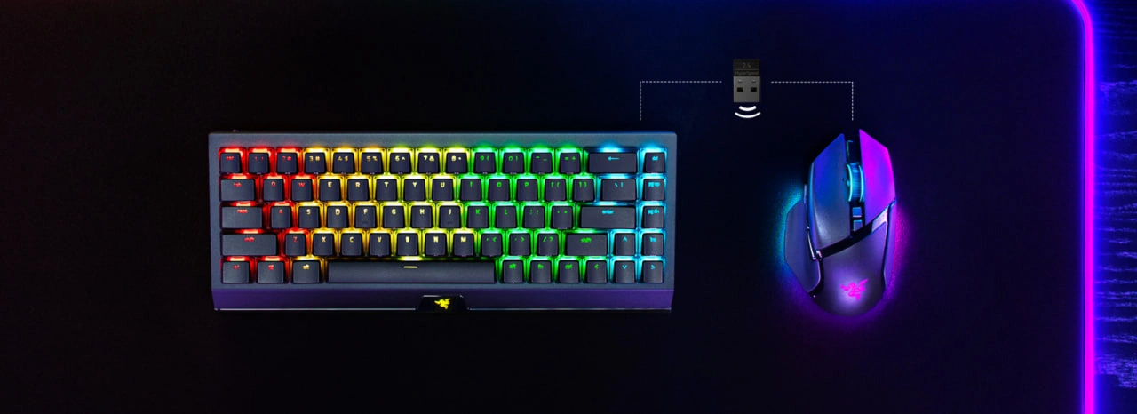 Наслаждайся ультрабыстрой игрой со скоростью на 25% выше, чем у других беспроводных технологий. Упрости настройку и освободи один USB порт, подключив беспроводную мышь и клавиатуру к одному USB передатчику — функция, которую можно использовать в наших новейших периферийных устройствах Razer HyperSpeed.