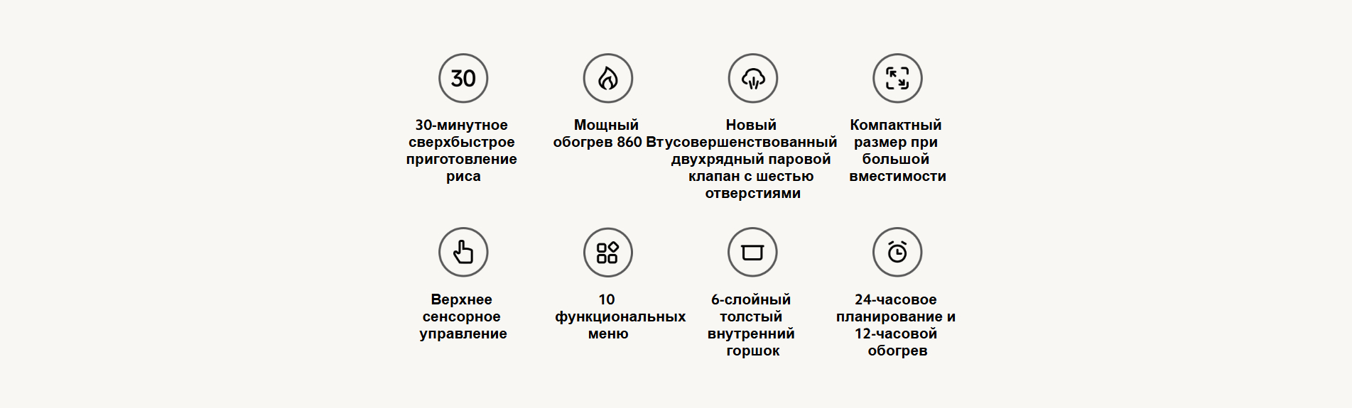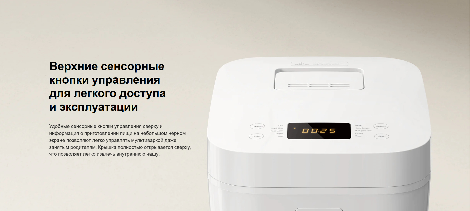 Верхняя панель оснащена сенсорным управлением — достаточно одного касания, чтобы выбрать нужную программу из 10 автоматических режимов. В их числе: рис, быстрый рис, каша, суп, пар, мультизлаковый рис, разогрев и другие. Даже неопытный пользователь сможет с лёгкостью управлять процессом приготовления.