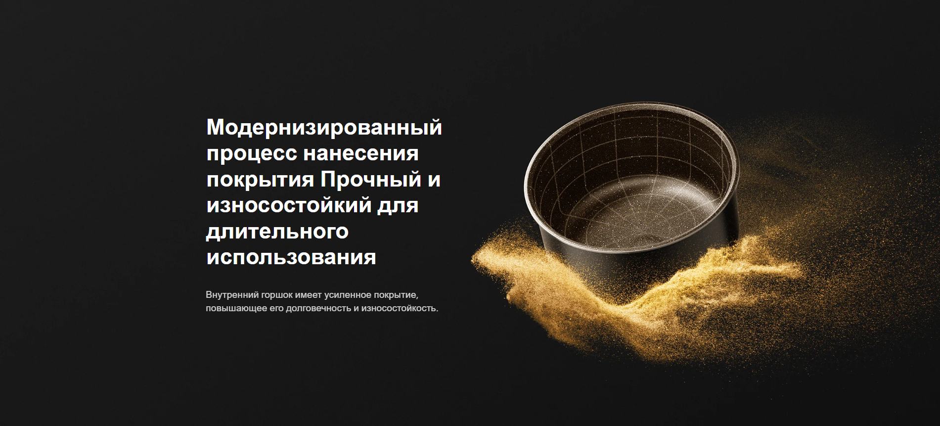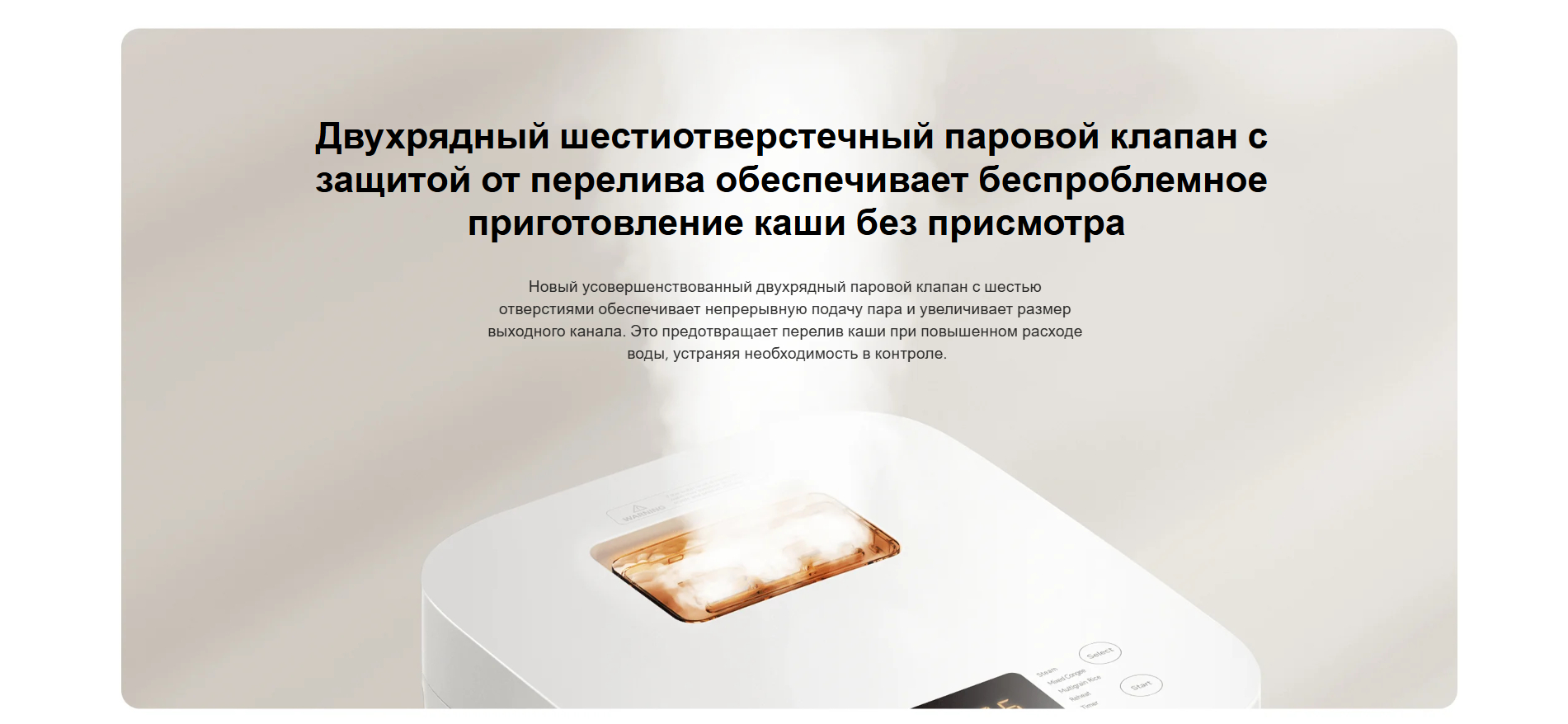 Обновлённый паровой клапан с шестью отверстиями защищает от перелива, предотвращая выброс пара и обеспечивая безопасность во время готовки. Это особенно важно при приготовлении жидких блюд, таких как каша или суп, где требуется стабильное давление.