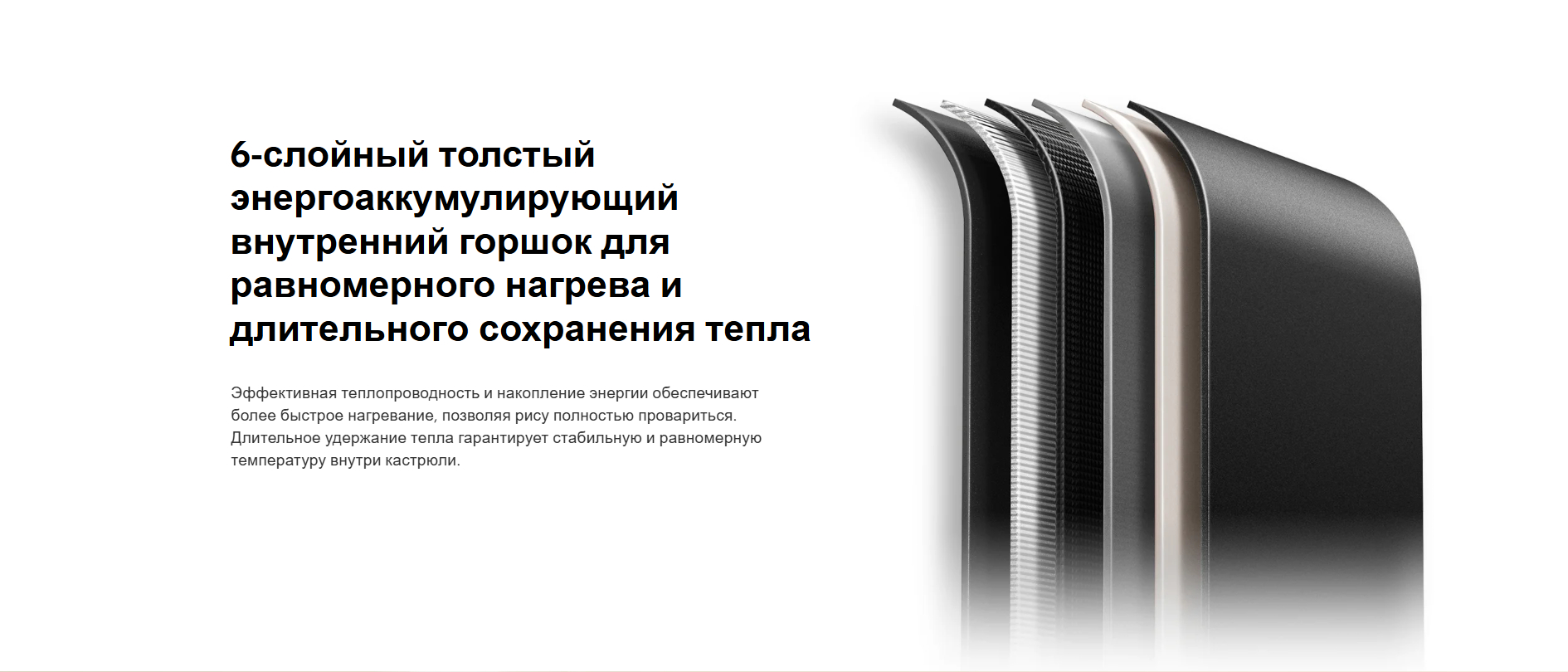 Мощность до 935 Вт обеспечивает быстрое и равномерное нагревание, а увеличенный 6-слойный внутренний котёл из алюминиевого сплава равномерно распределяет тепло, сохраняя аромат и структуру каждого зерна. Энергосберегающая технология способствует устойчивому температурному режиму, благодаря чему рис всегда получается рассыпчатым и нежным.