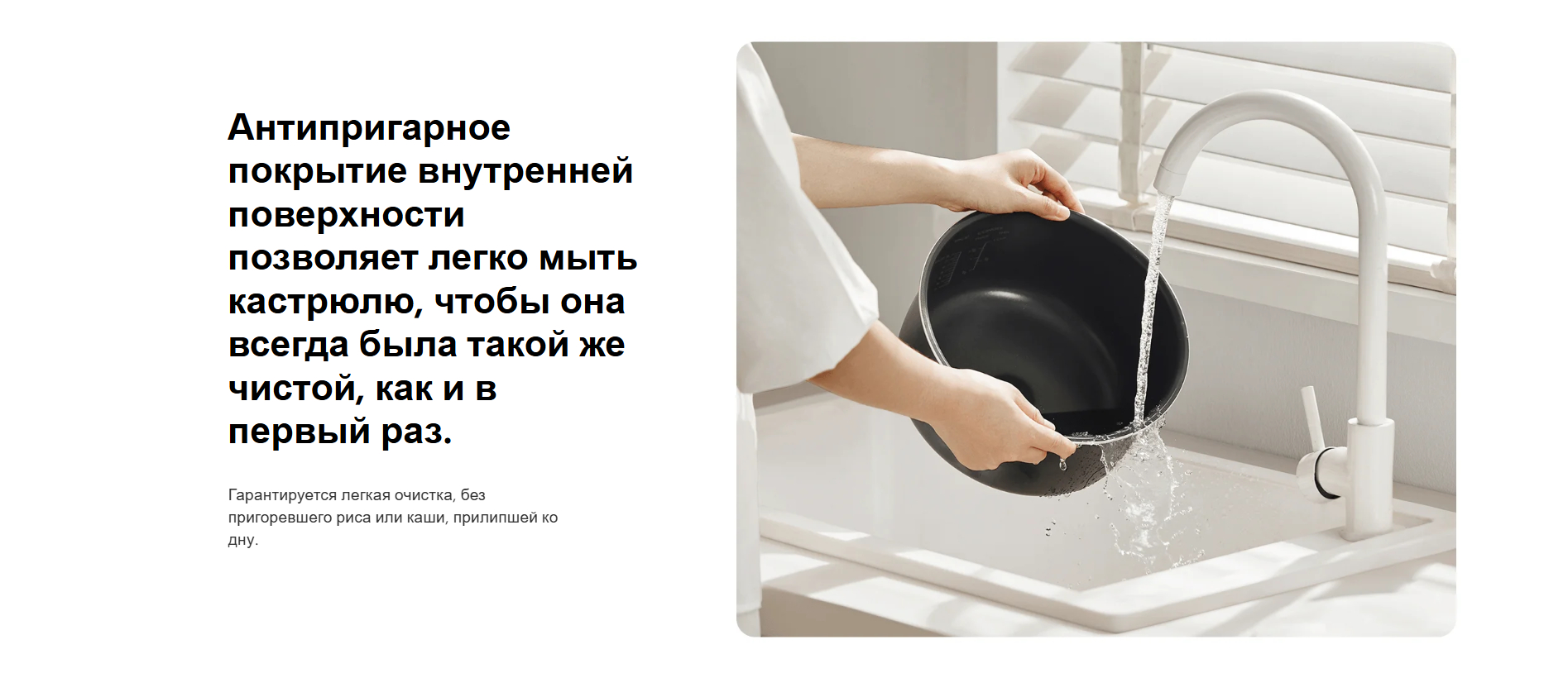 Особое внимание уделено удобству ухода: внутренняя крышка и паровой клапан съёмные, что облегчает глубокую очистку и предотвращает накопление бактерий. Антипригарное покрытие чаши надёжно защищает от пригорания, делая процесс мытья лёгким и быстрым — без лишнего трения и усилий.