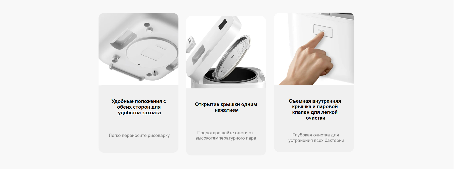 Дополнительное удобство обеспечивают прорезиненные ручки и функция однокнопочного открытия крышки — безопасно, без риска ожога паром. Все детали продуманы до мелочей, чтобы ежедневное использование приносило комфорт и удовольствие.