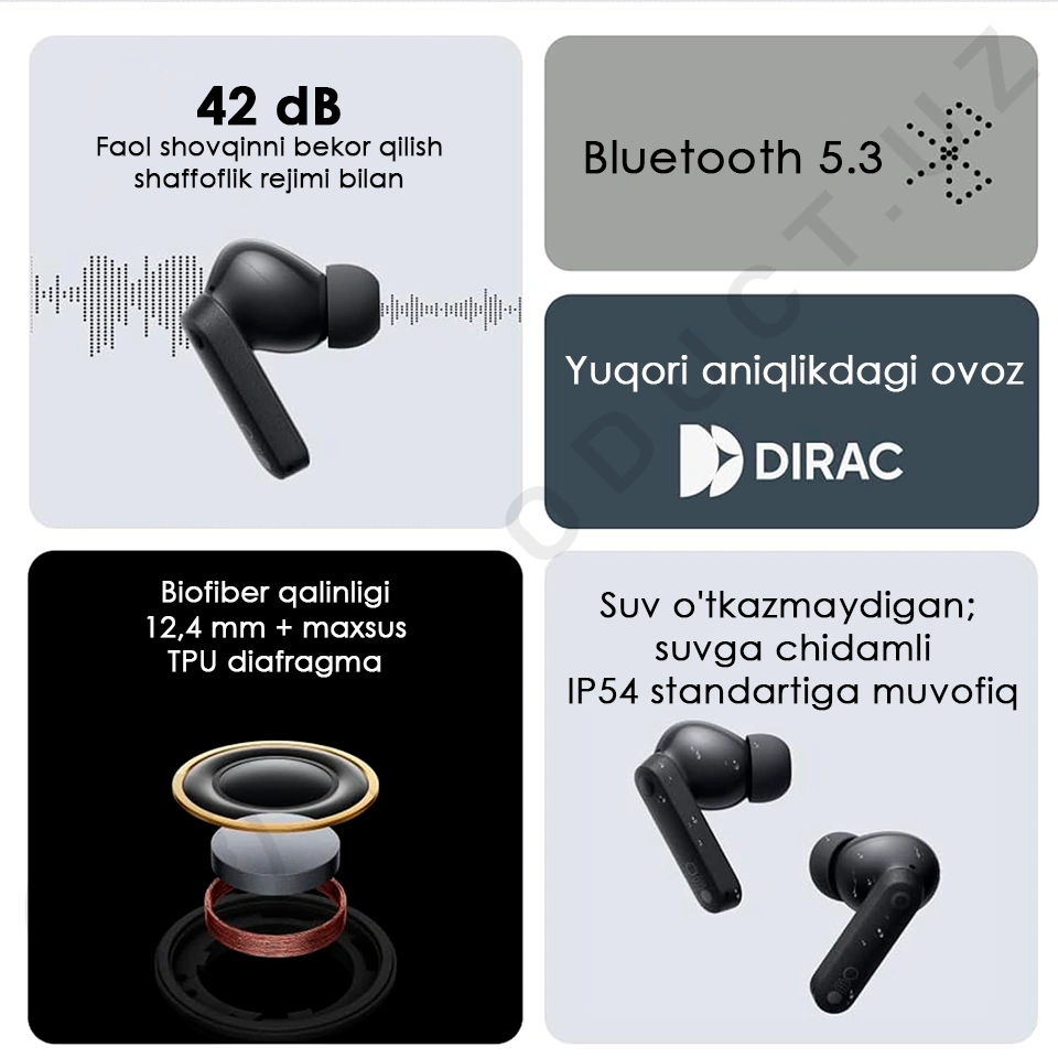 2900 Gts gacha bo'lgan tarmoqli kengligi Shaffoflik rejimida 42 dB faol shovqinni kamaytirishni ta'minlaydi, kiruvchi shovqinlarni bloklaydi.