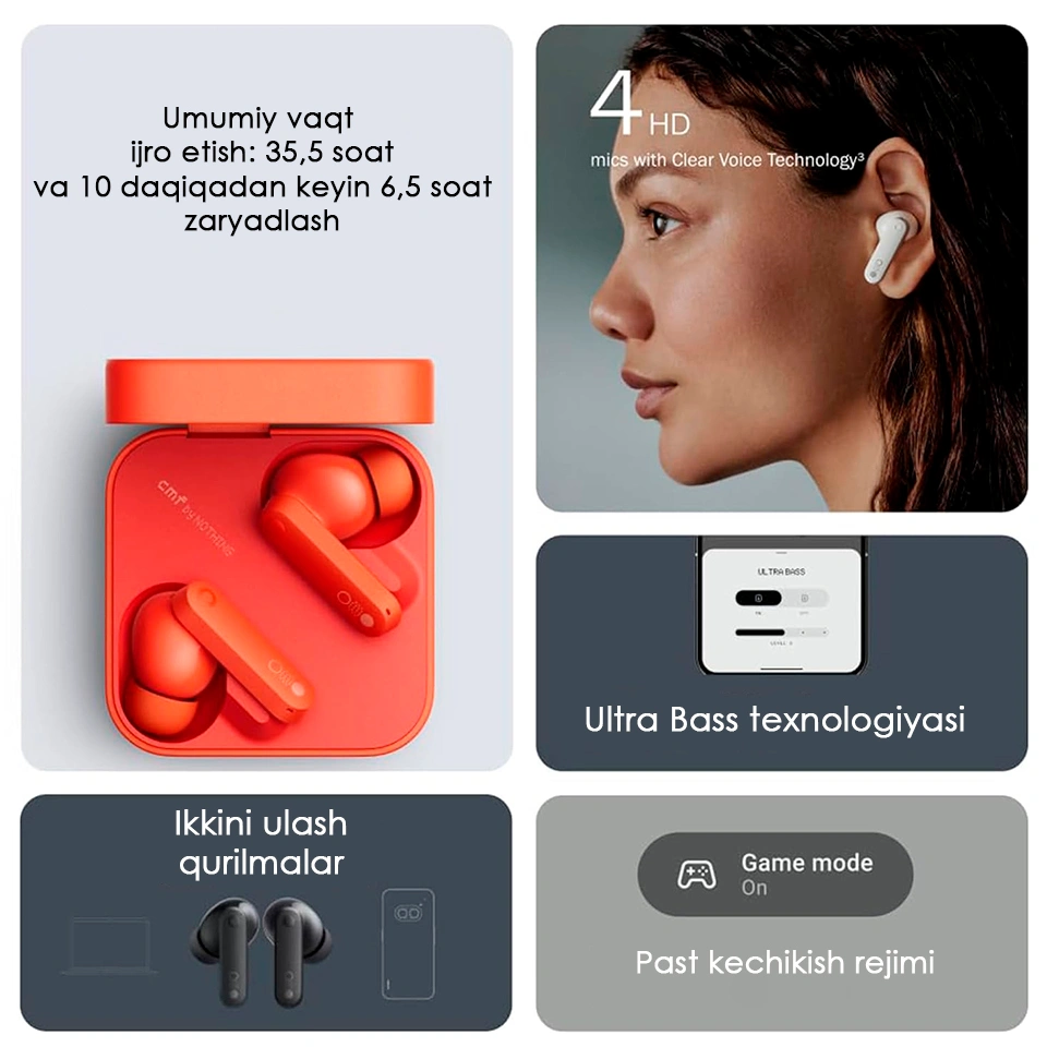 - Bluetooth 5.3 va tezkor ulanish. Bluetooth eshitish vositasi sifatida CMF Bluetooth quloqchinlari ikkita qurilma ulanishini, shuningdek, Google Fast Connection va Bluetooth 5.3 bilan Microsoft Fast Connection-ni qo'llab-quvvatlaydi.