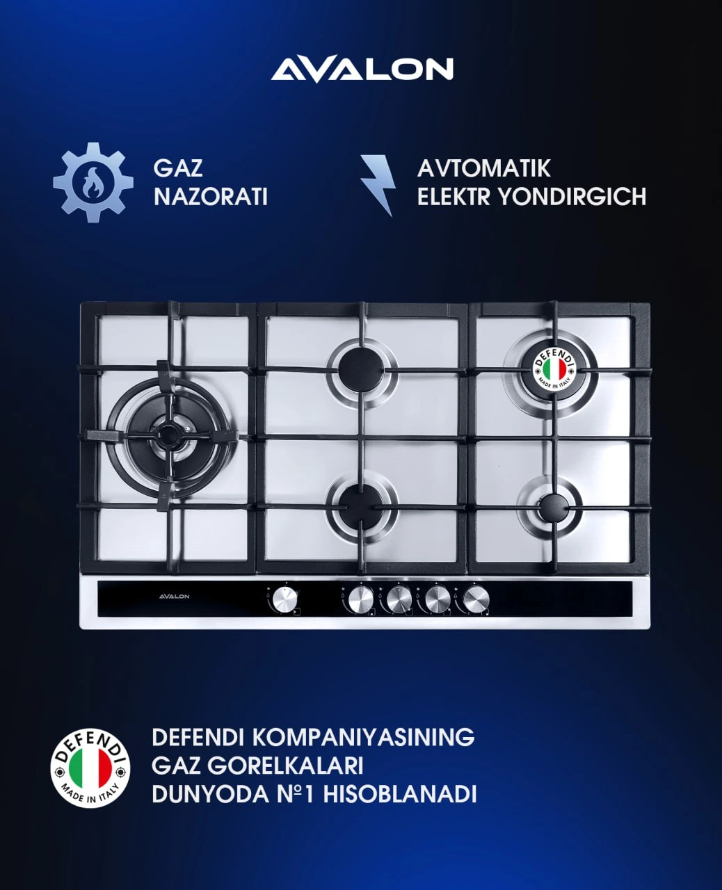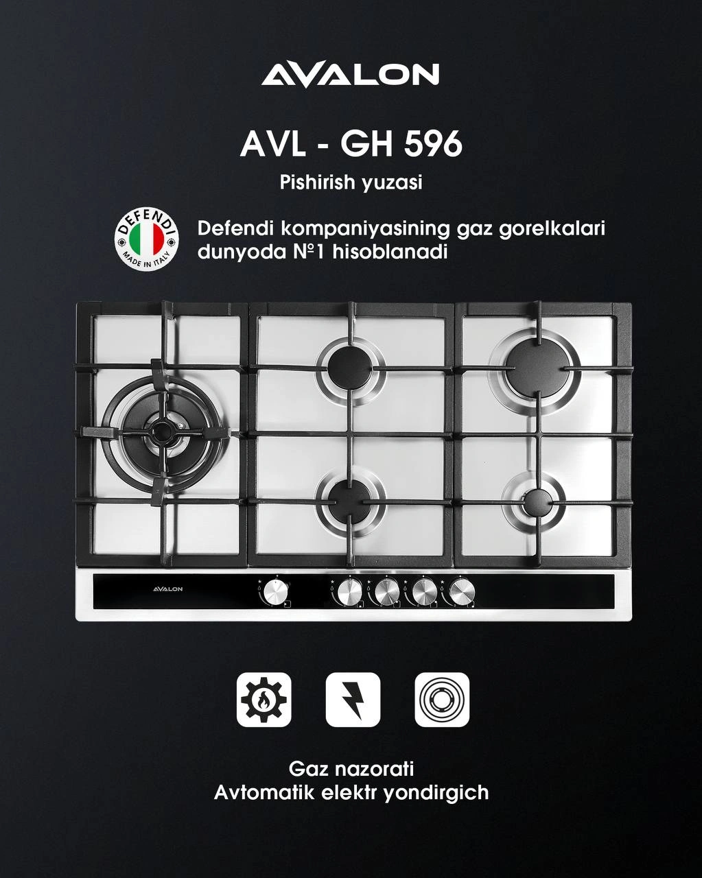 Газовая варочная панель AVL- GH 596 ширина которой составляет 90 см – хороший выбор для тех, кому нравится еда, приготовленная на живом огне. Пять конфорок различной мощности дают возможность создавать множество блюд одновременно. Каждую горелку контролирует специальный датчик. Стоит пламени погаснуть из-за сквозняка или по другой причине, и тут же подача топлива прекратится.