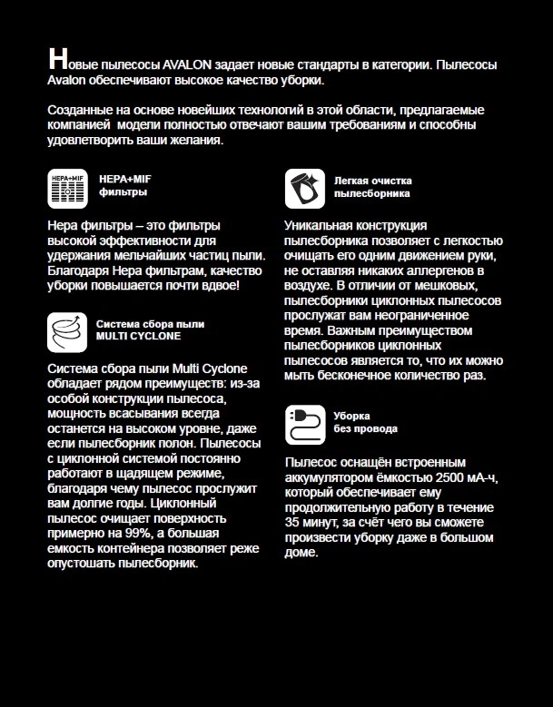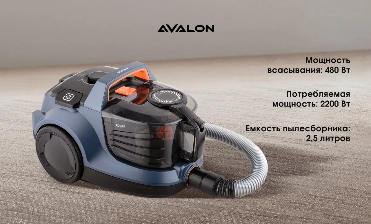 Пылесос Avalon VCC 2255 – это сочетание стильного дизайна и эффективной очистки. Мощность всасывания в циклонном пылесосе Avalon равна 480 Вт. При этом максимальный уровень потребляемой мощности составляет 2200 Вт. Небольшой вес и компактный дизайн позволяют перемещать его по дому без особого труда.