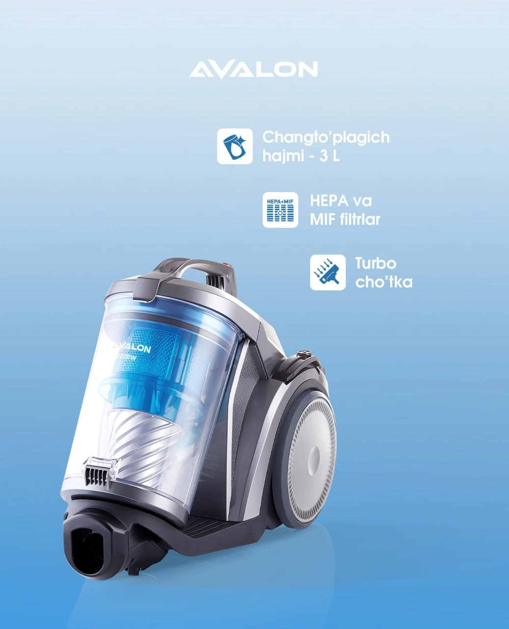 Пылесос AVALON снабжен циклонным фильтром, сохраняющим высокую силу всасывания при длительной работе. Он собирает мусор в практичный пластиковый контейнер, позволяя обходиться без одноразовых мешков. К нему прилагаются HEPA+MIF фильтры, которые задерживают более 90% мелкой пыли и других аллергенов. Благодаря этому в доме создается комфортная здоровая обстановка.