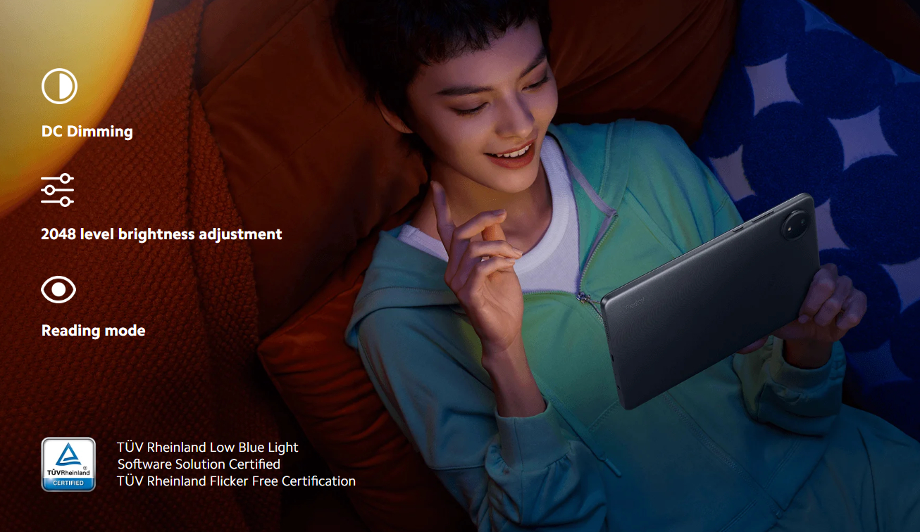 Постоянное прямое затемнение и режим чтения дисплея планшета, сертифицированного TÜV Rheinland Low Blue Light и Flicker Free, обеспечивают комфорт для глаз и дают вам душевное спокойствие при длительном использовании.
