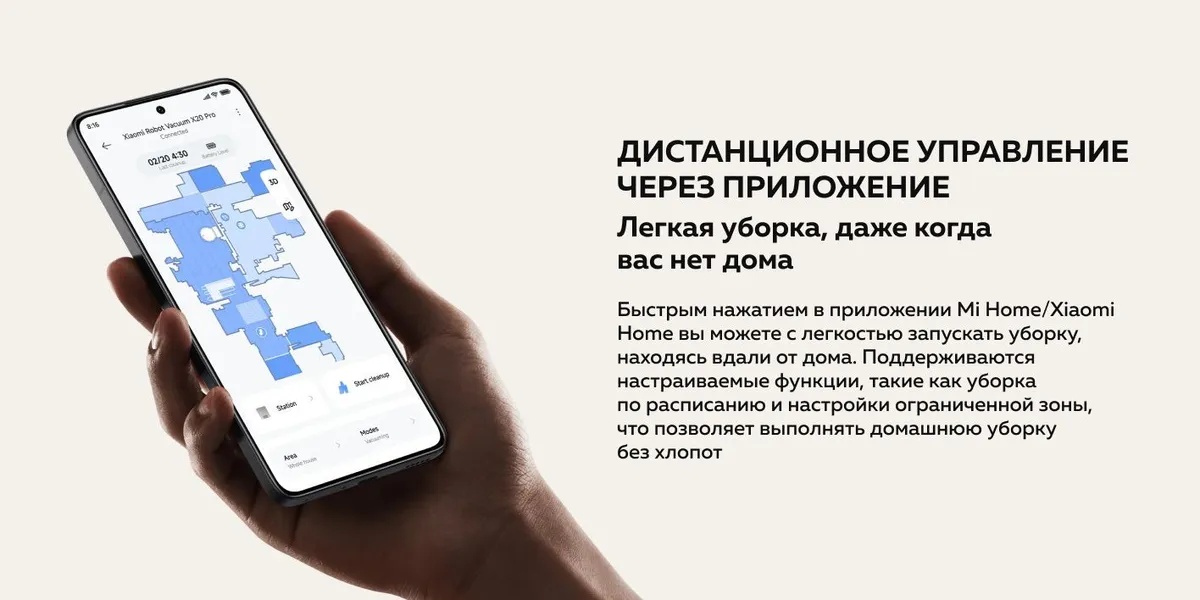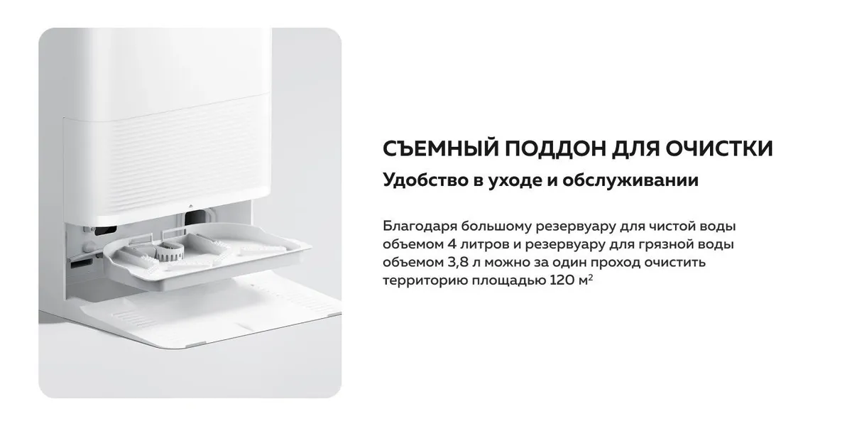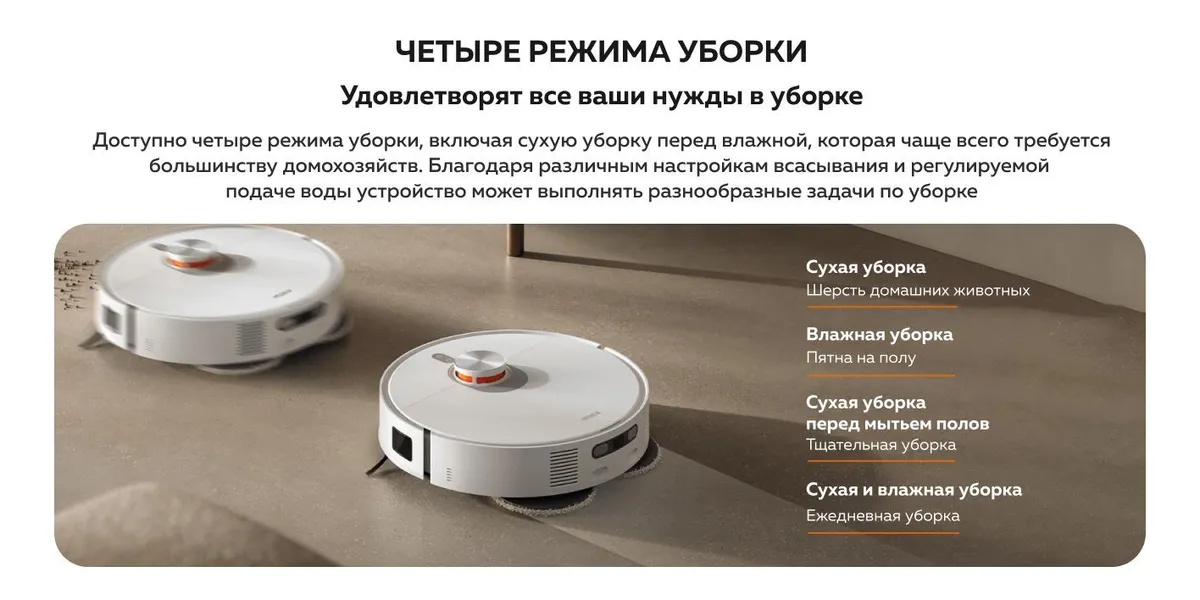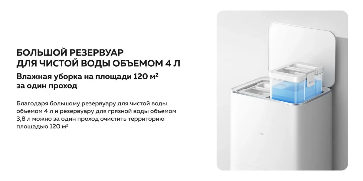три режима подачи воды для влажной уборки , расчет времени уборки , управление со смартфона