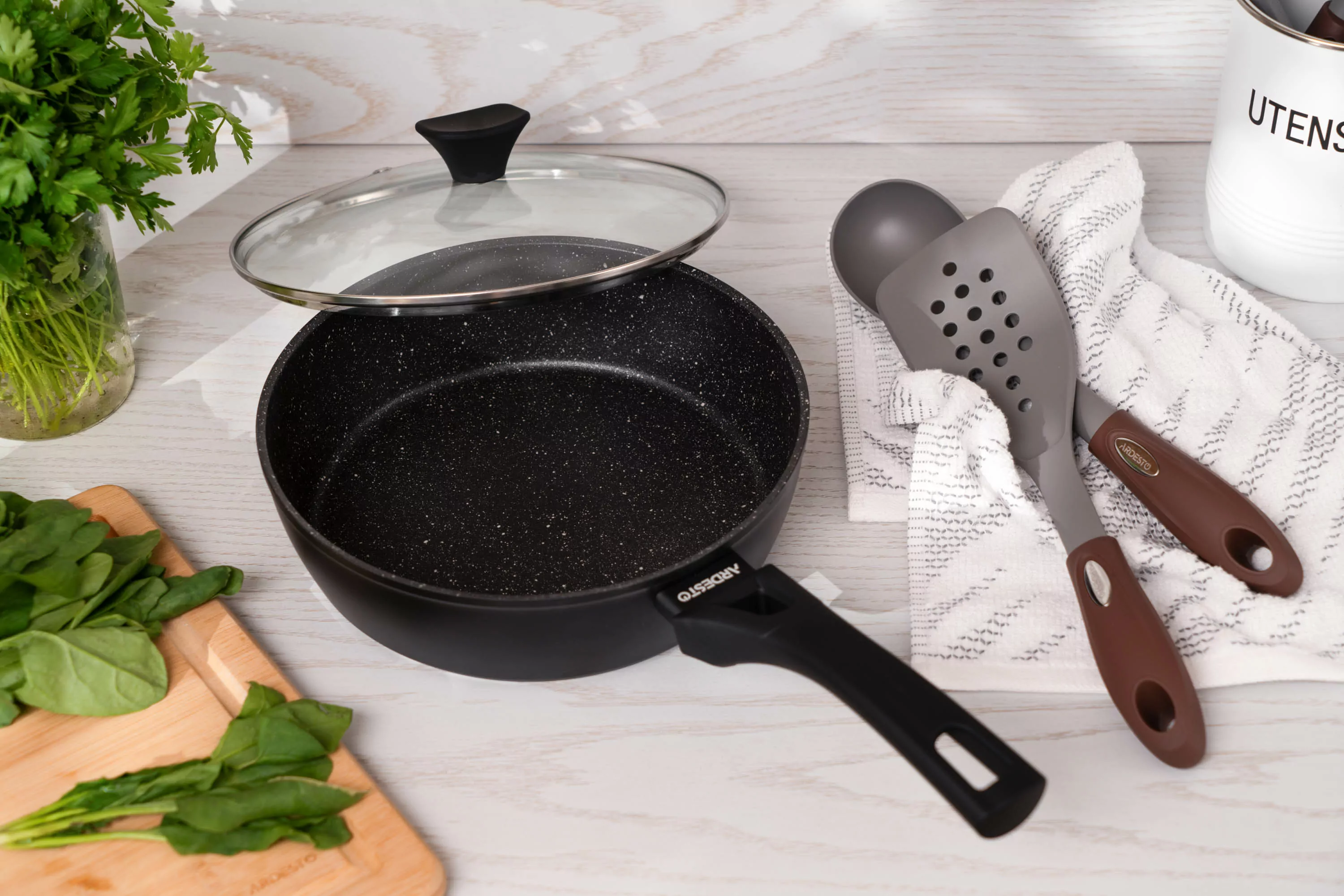 Стеклянная крышка, входящая в комплект, позволяет следить за процессом готовки, сохраняя тепло и аромат внутри сковороды. Благодаря этому вы сможете тушить, запекать и готовить блюда с соусами без потери вкуса и полезных веществ.