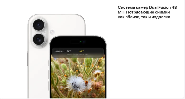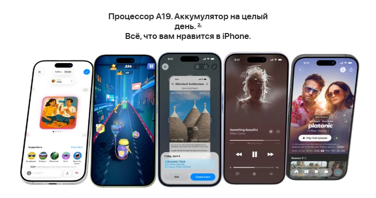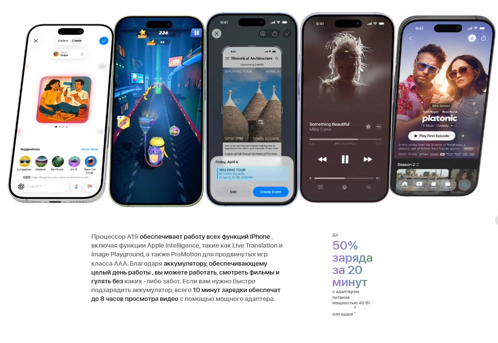 Высокую производительность смартфона обеспечивает новый процессор Apple A19. Этот чип разработан для обеспечения высокой скорости работы приложений, эффективной многозадачности и поддержки современных мобильных игр. Улучшенная архитектура процессора обеспечивает оптимальный баланс между мощностью и энергоэффективностью, благодаря чему смартфон способен работать целый день без необходимости частой подзарядки.