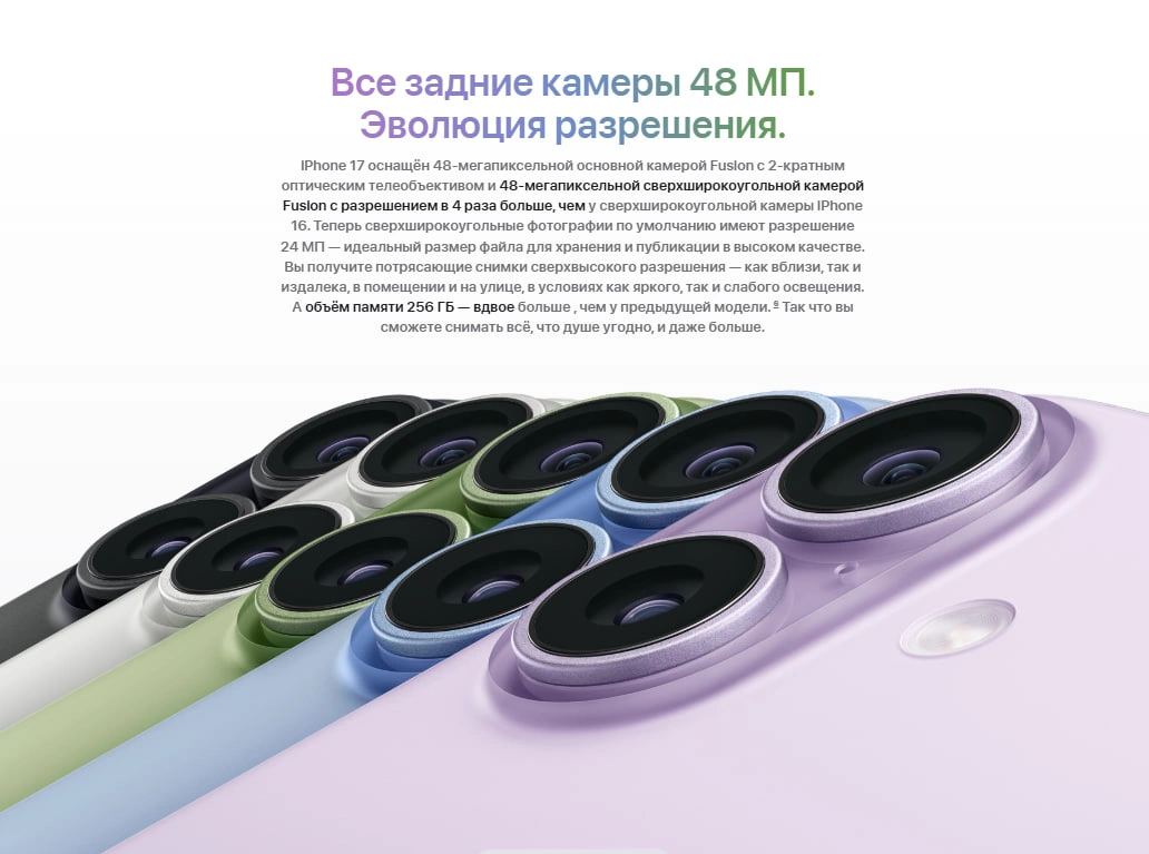 Отдельного внимания заслуживает усовершенствованная система камер iPhone 17. Основная камера с разрешением 48 МП позволяет получать фотографии с высокой детализацией, естественными цветами и отличной резкостью. Дополнительная ультраширокоугольная камера также получила разрешение 48 МП, что позволяет снимать масштабные сцены, пейзажи и архитектуру без потери качества. Поддержка ночного режима и современных алгоритмов обработки изображения обеспечивает яркие и четкие снимки даже при недостаточном освещении. Благодаря функции 2-кратного телезума пользователи могут приближать объекты, сохраняя высокую детализацию изображения.