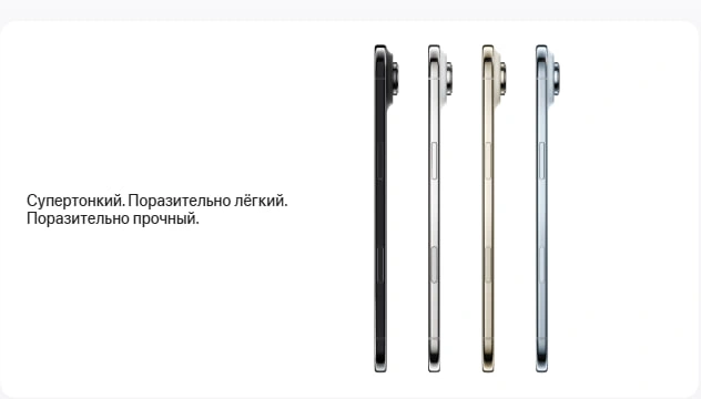 iPhone Air выпускается в четырёх утончённых цветах: Space Black, Cloud White, Light Gold и Sky Blue. Это устройство для тех, кто ценит эстетику, скорость и надёжность в каждом движении.