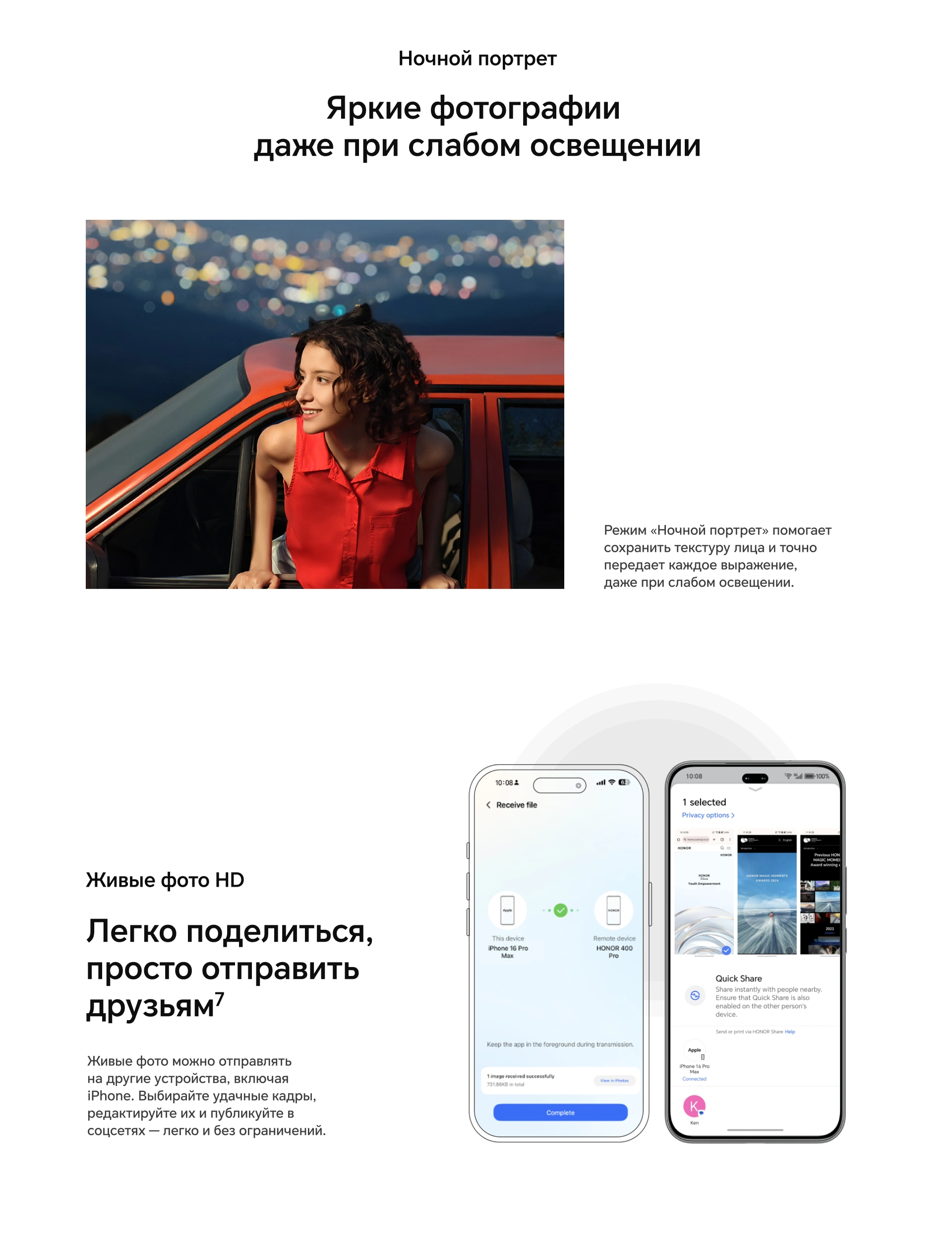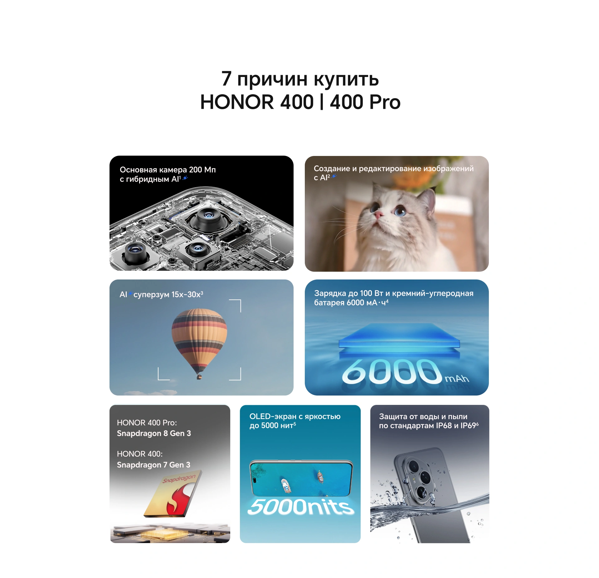HONOR 400 — это мощный смартфон с большим экраном и высоким разрешением. Устройство оснащено ярким и четким AMOLED дисплеем с диагональю 6,55 дюймов и разрешением 2736 x 1264 пикселей, который обеспечивает отличное качество изображения и комфортное использование.