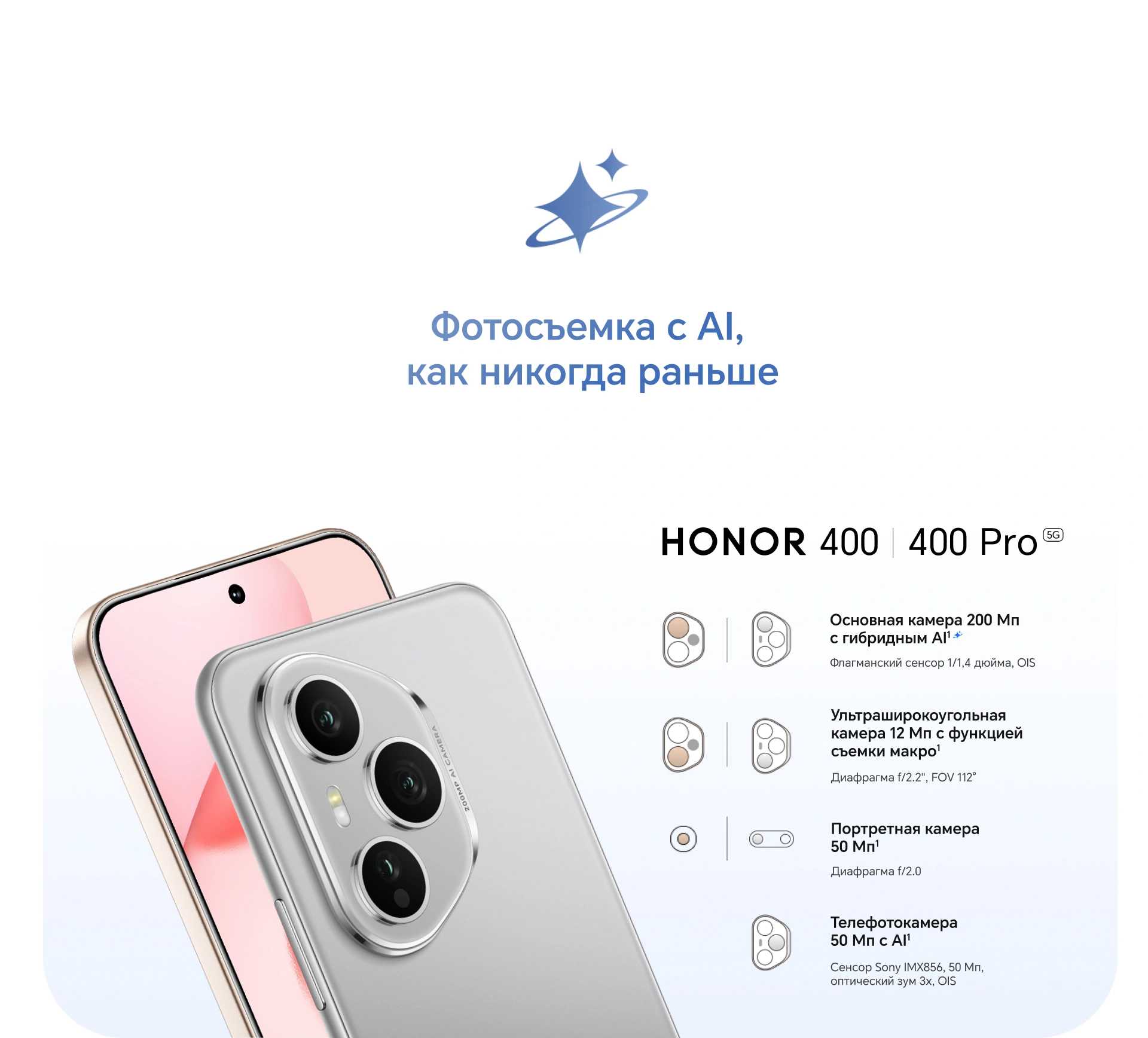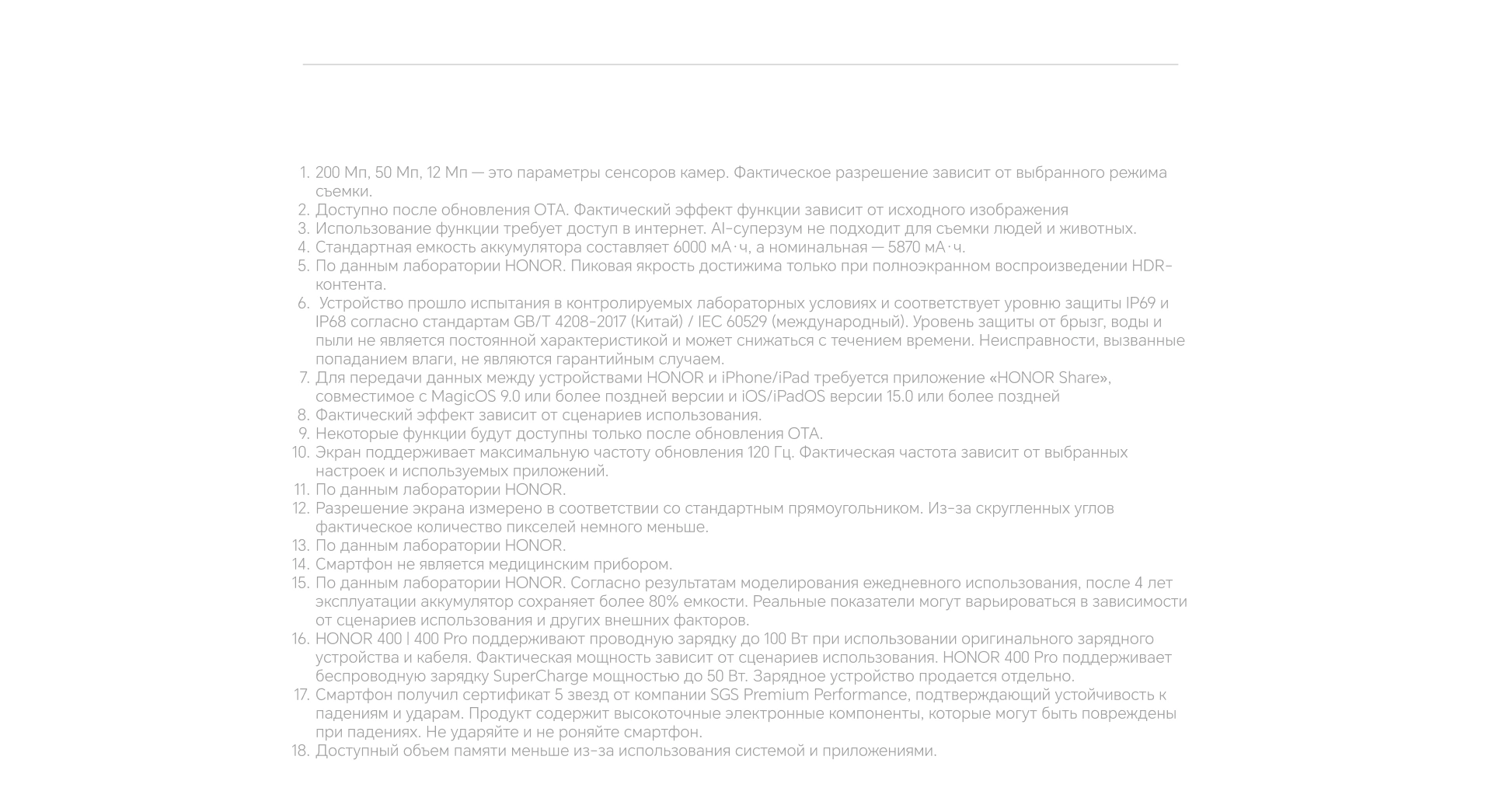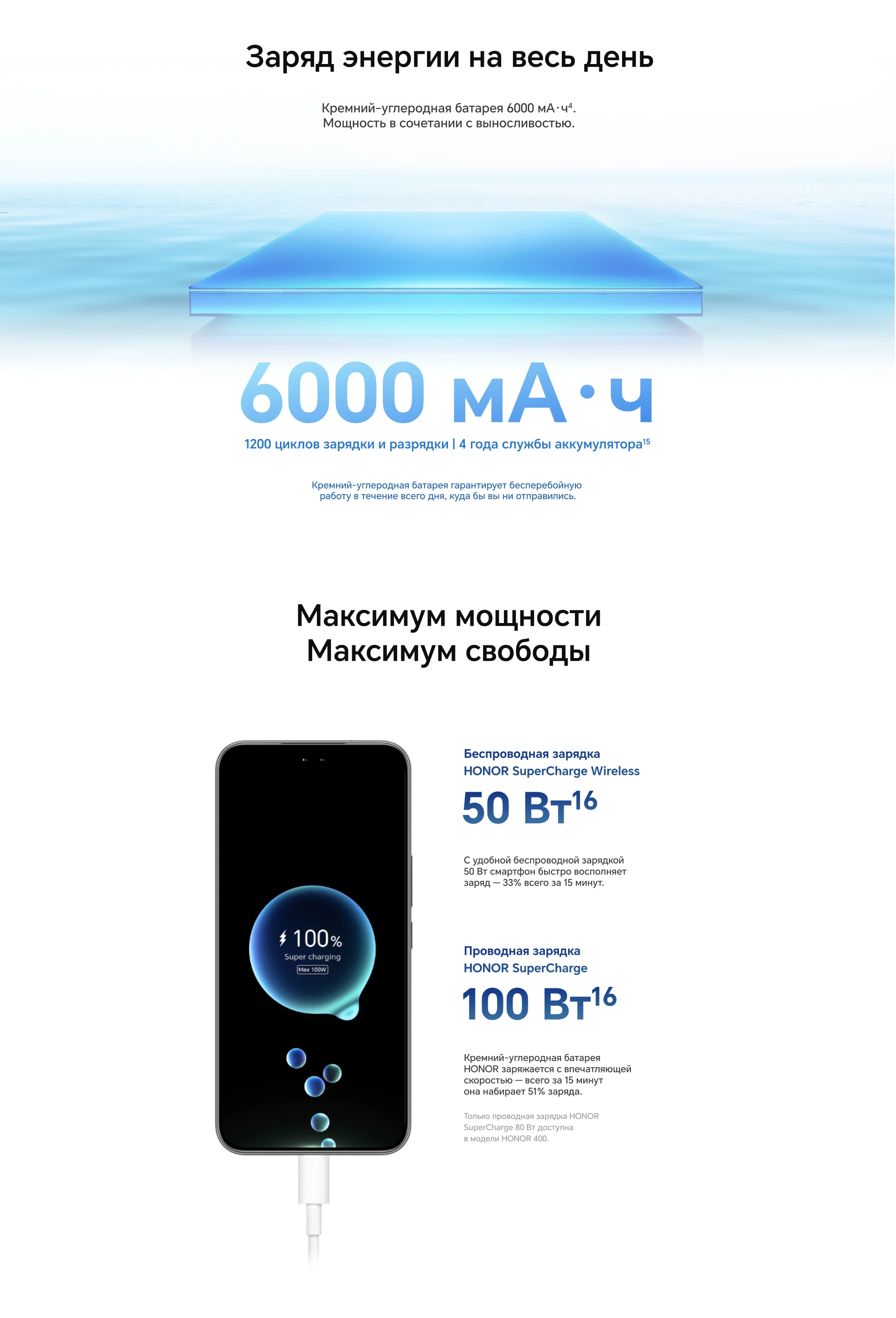 Смартфон имеет емкий аккумулятор на 6000 мАч, что обеспечивает длительное время работы без подзарядки. HONOR 400 также поддерживает быструю зарядку мощностью 50 Вт, что позволяет быстро восстановить заряд батареи.