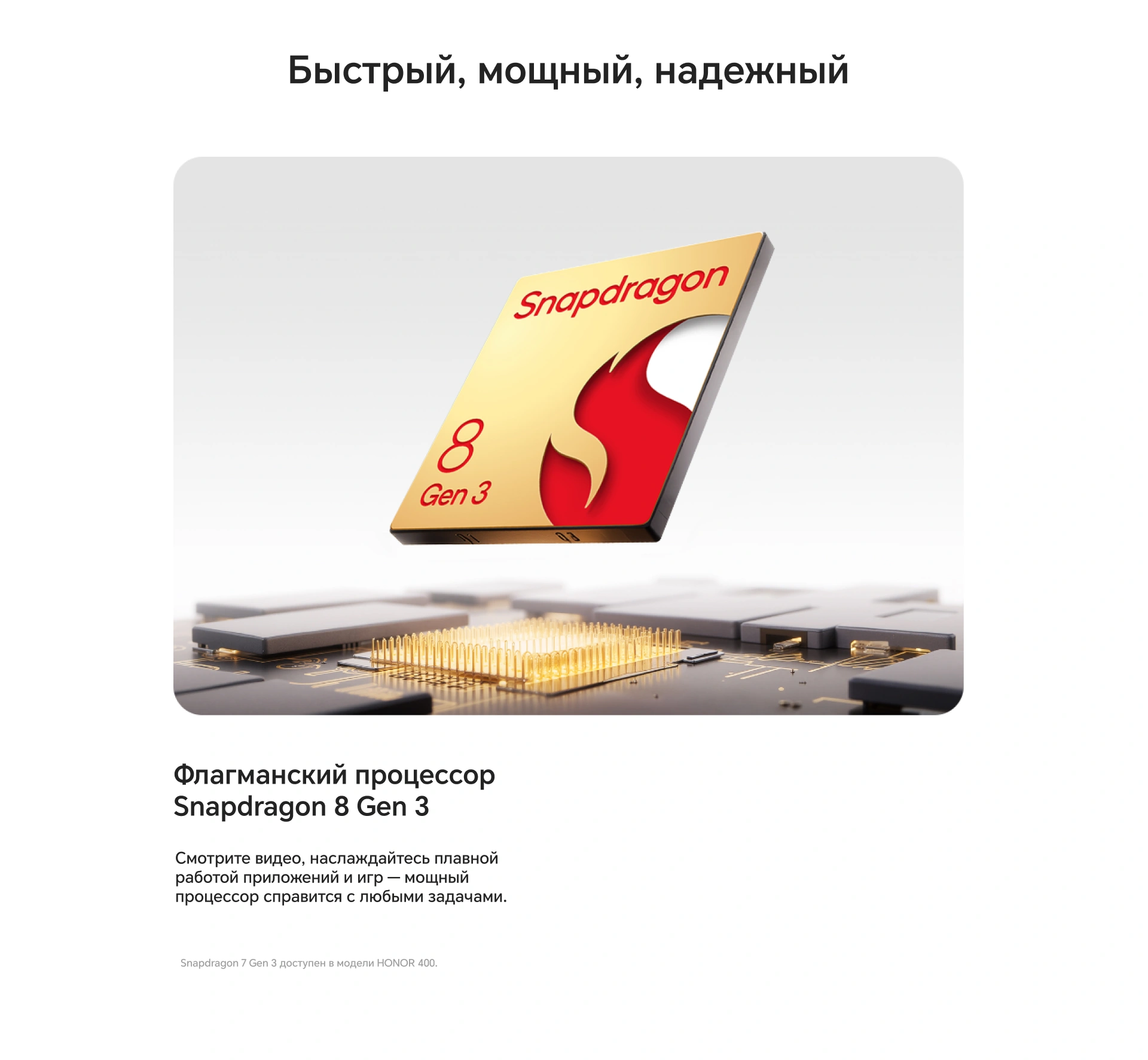 HONOR 400 оснащен мощным процессором Qualcomm Snapdragon 7 Gen 3, что обеспечивает быструю и плавную работу устройства. Смартфон также имеет большой объем оперативной памяти, что позволяет ему легко справляться с многозадачностью и запускать требовательные приложения.