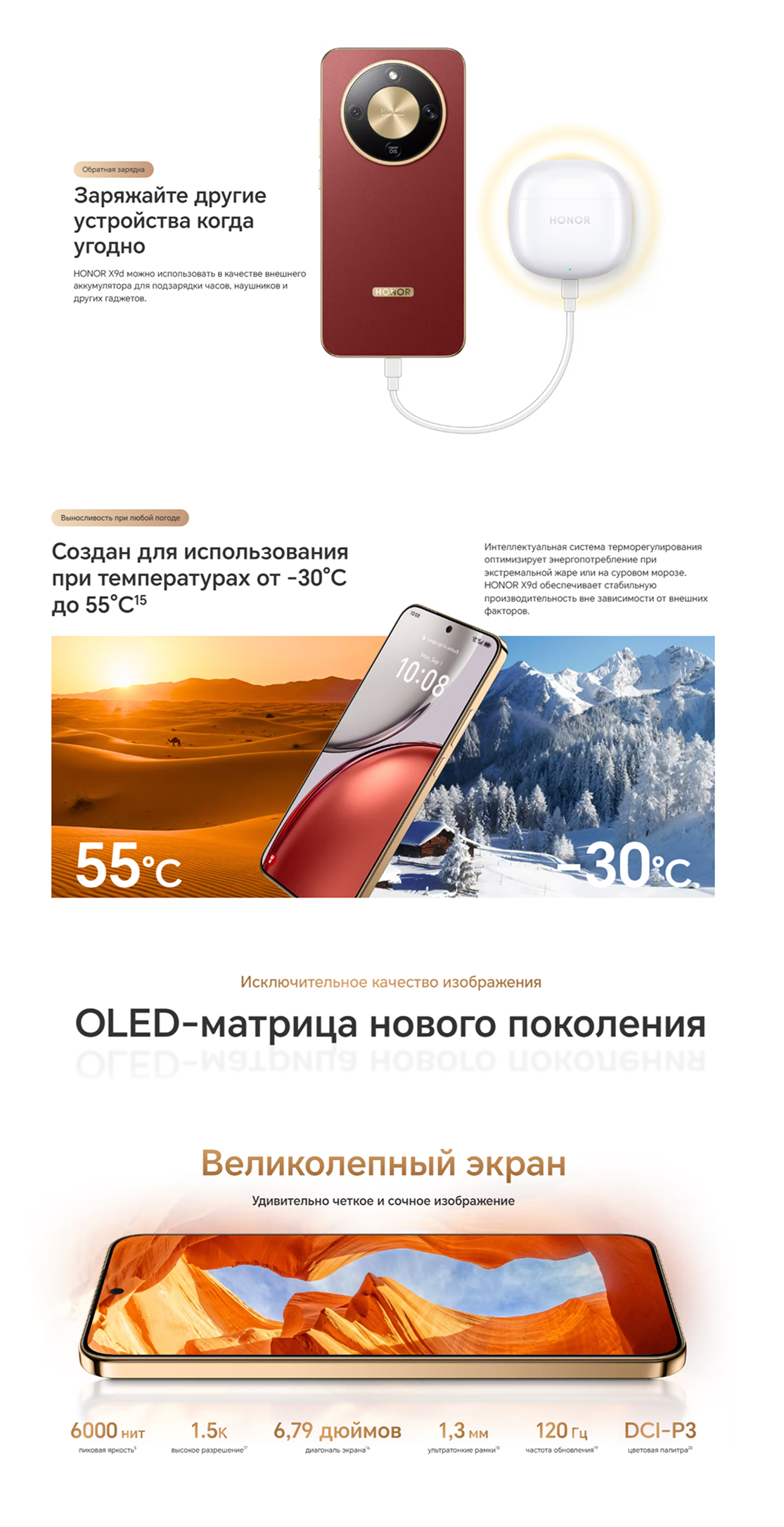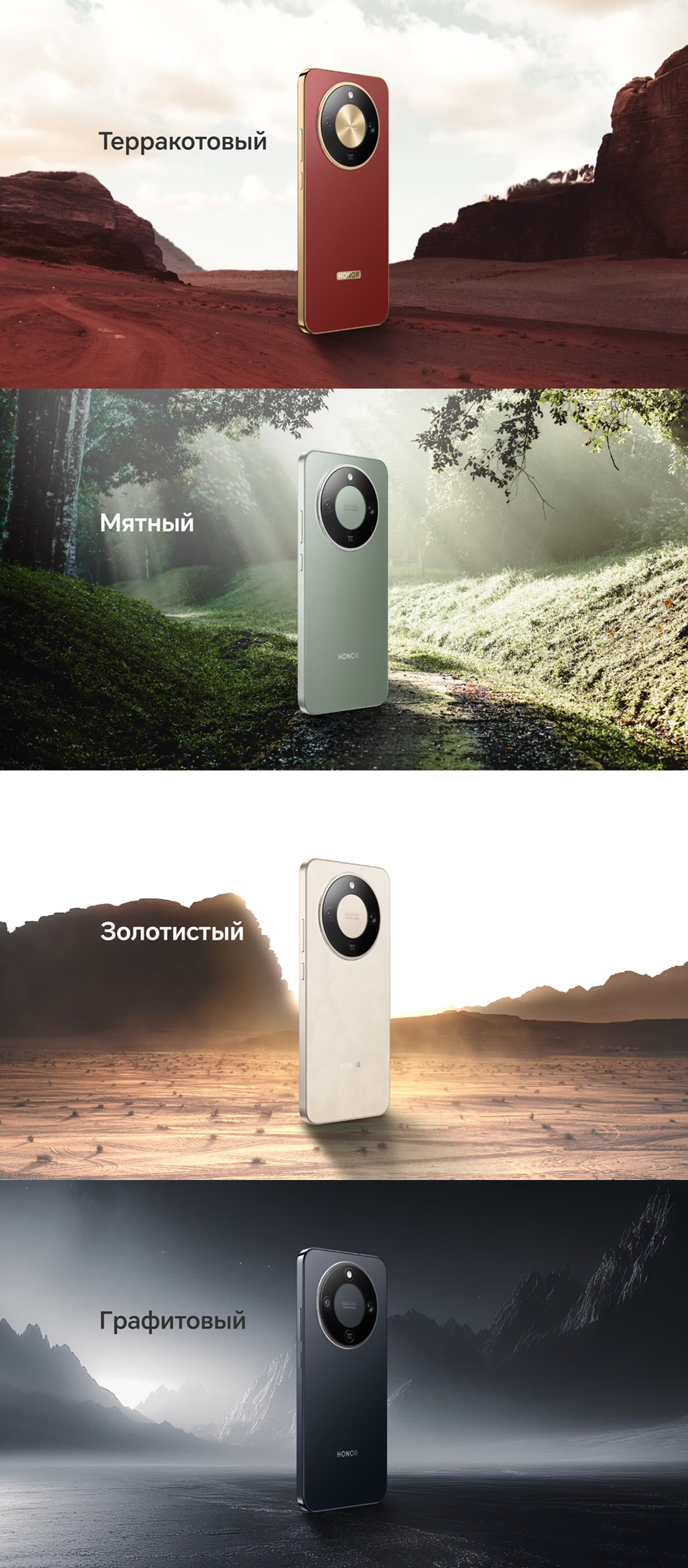 HONOR X9d сочетает изящный корпус толщиной всего 7,76 мм и лёгкий вес 193 г. Прочное алюмосиликатное стекло, приятные цвета — терракотовый, графитовый, золотистый, мятный.