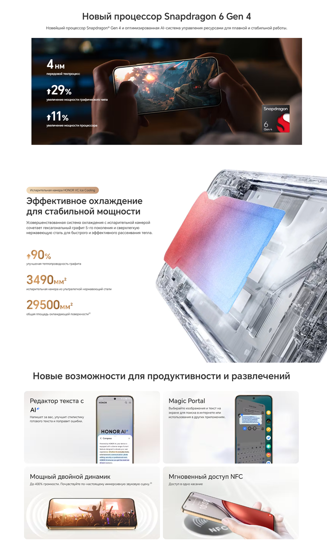 - Процессор Snapdragon 6 Gen 4 — высокая скорость работы и энергоэффективность.