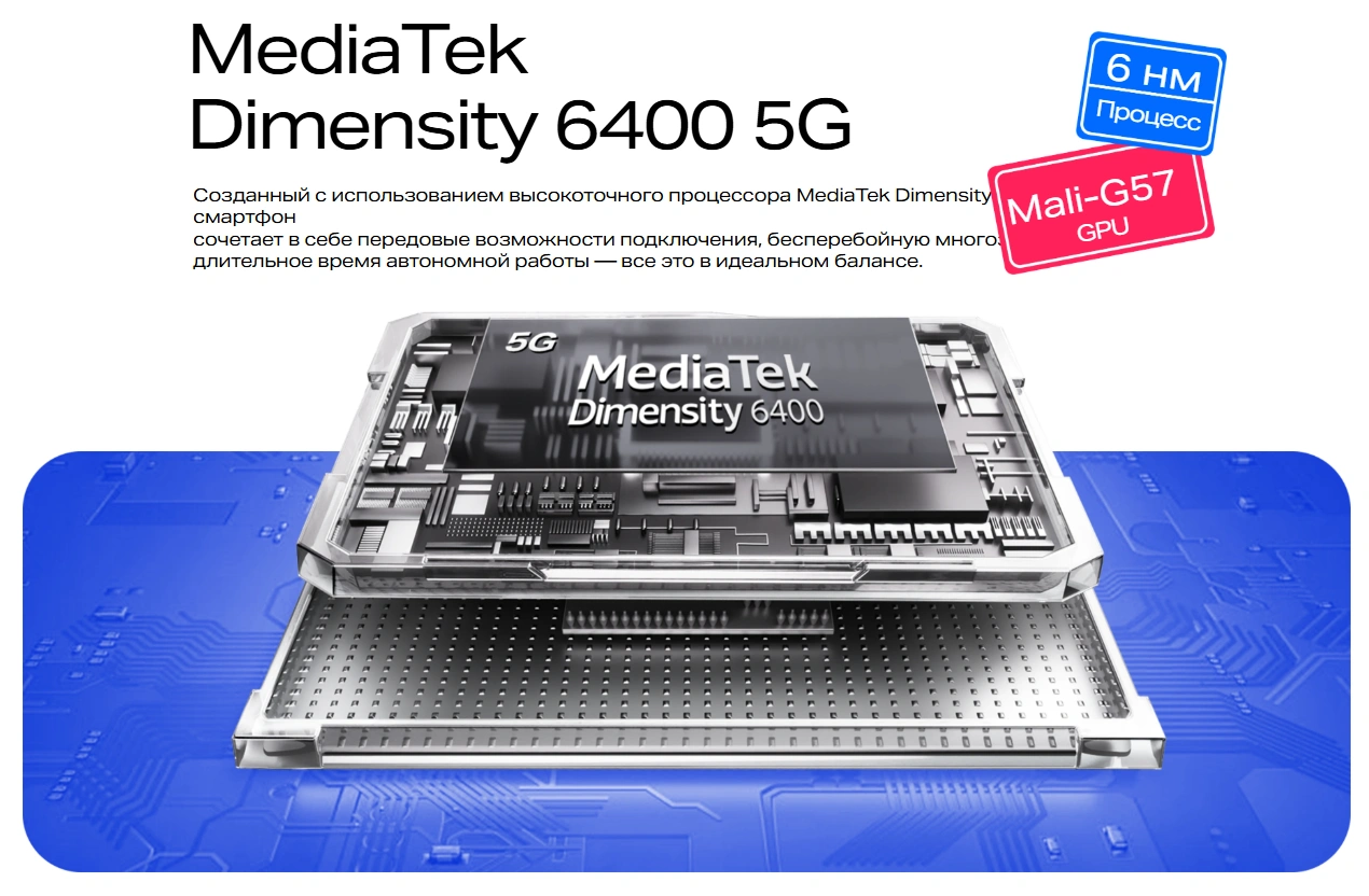 Созданный с использованием высокоточного процессора MediaTek Dimensity 6400 5G, этот смартфон- сочетает в себе передовые возможности подключения, бесперебойную многозадачность и