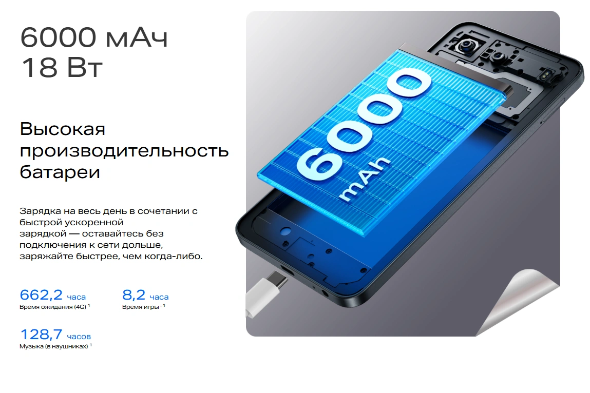 - Высокая производительность аккумулятора 6000 мАч 18 Вт