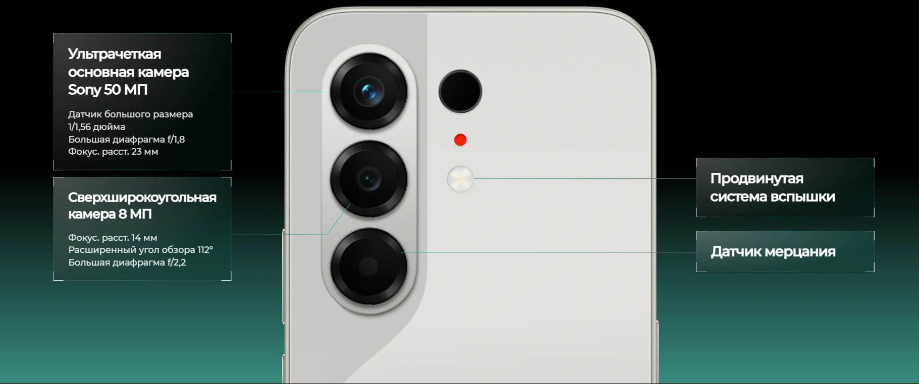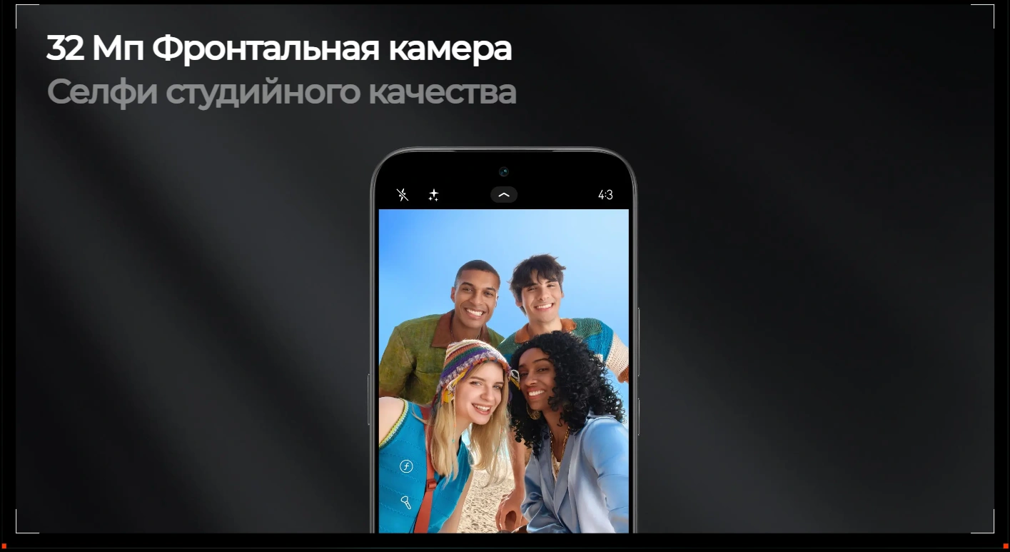 Особое внимание уделено камерам. Основной сенсор Sony на 50 Мп с оптической стабилизацией позволяет получать четкие и детализированные снимки даже в сложных условиях освещения. Ультраширокоугольная камера расширяет возможности съемки, а фронтальная камера на 32 Мп обеспечивает качественные селфи. Интеллектуальные функции на базе искусственного интеллекта автоматически улучшают фотографии, помогая добиться профессионального результата без дополнительных усилий.