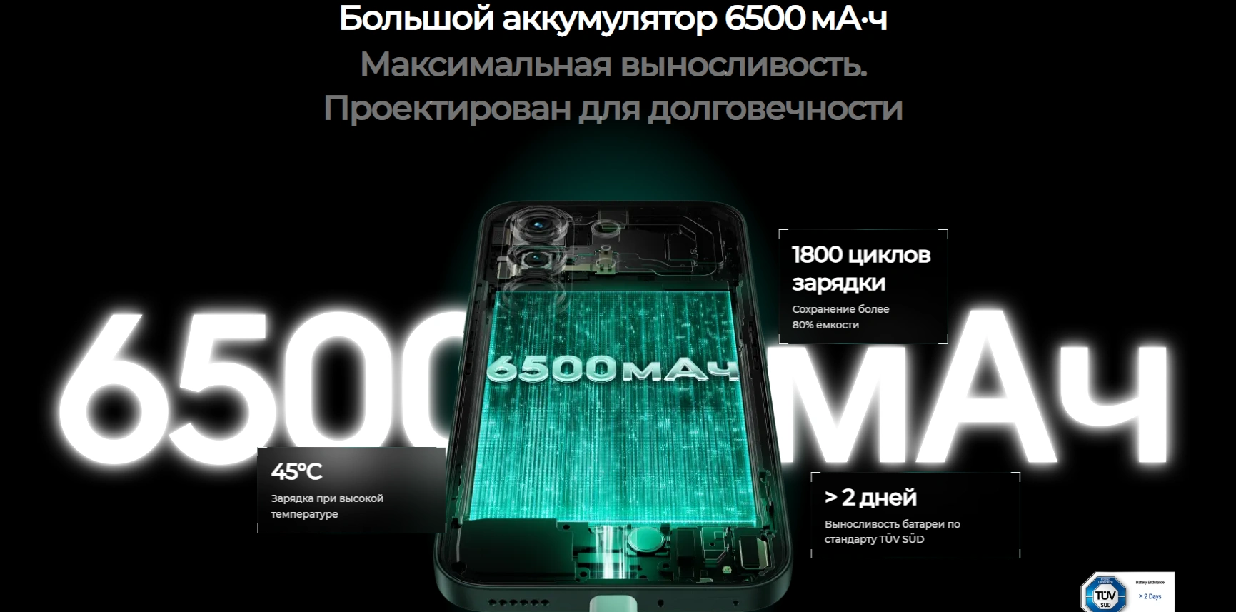 Одним из ключевых преимуществ устройства является аккумулятор емкостью 6500 мАч. Он обеспечивает длительную автономную работу — более двух дней без подзарядки. Поддержка быстрой зарядки 45 Вт позволяет быстро восстановить заряд и продолжить использование без длительных перерывов.