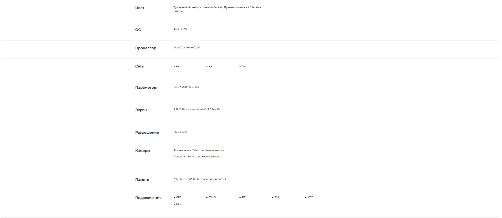 Производительность обеспечивает современный процессор MediaTek Helio G200, дополненный большим объёмом памяти: до 16 ГБ оперативной (с учетом виртуальной расширяемой) и до 256 ГБ встроенной. Такая конфигурация позволяет легко справляться с многозадачностью, требовательными приложениями и играми.
