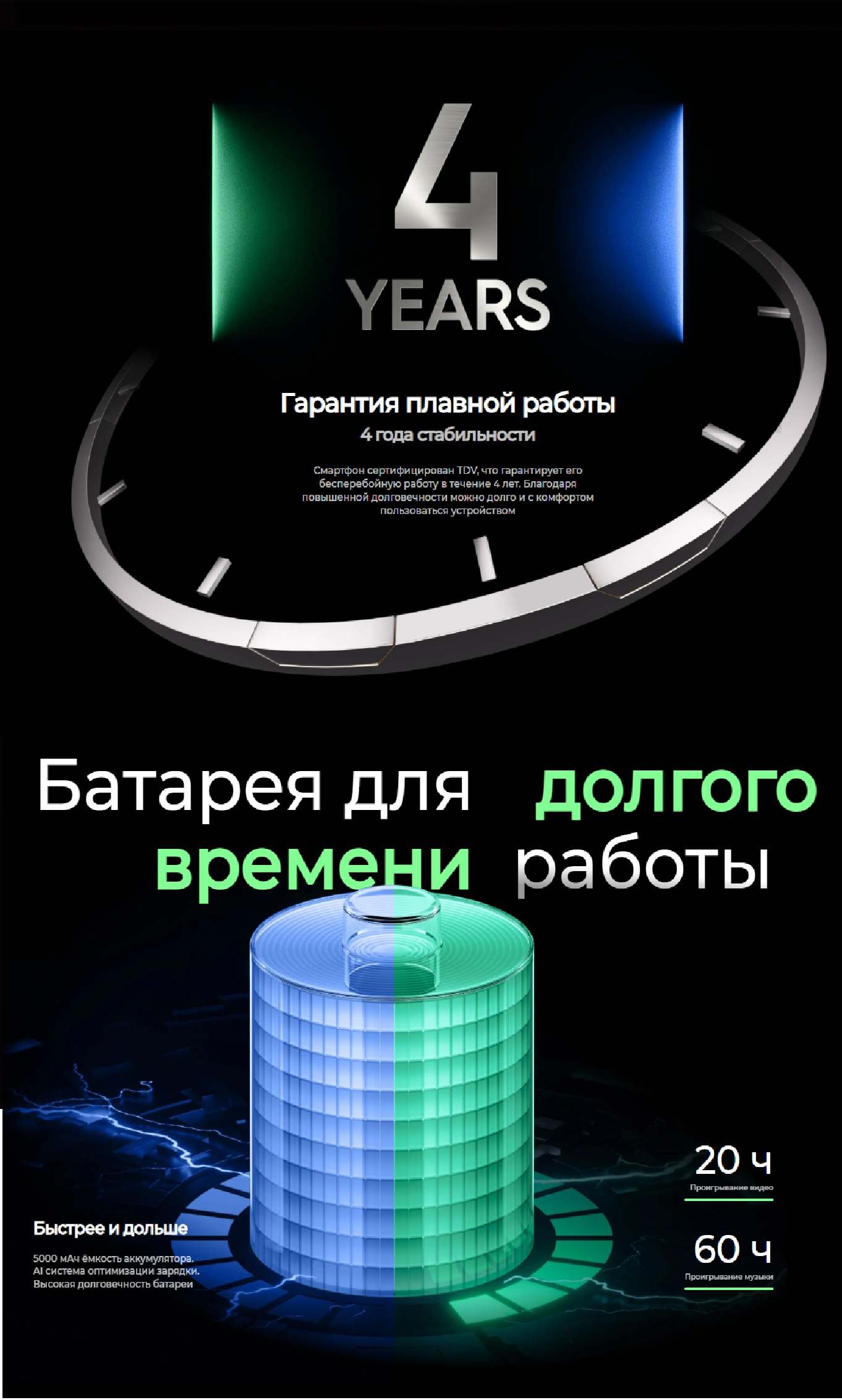- Аккумулятор 5000 mAh с поддержкой быстрой зарядки 15 Вт через Type-C.