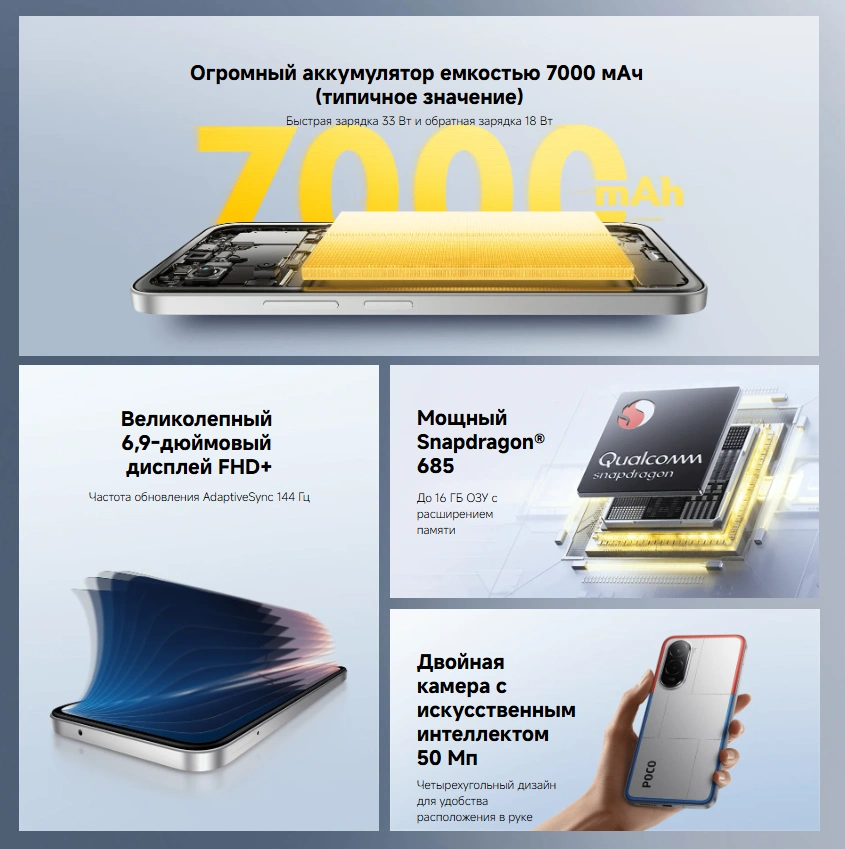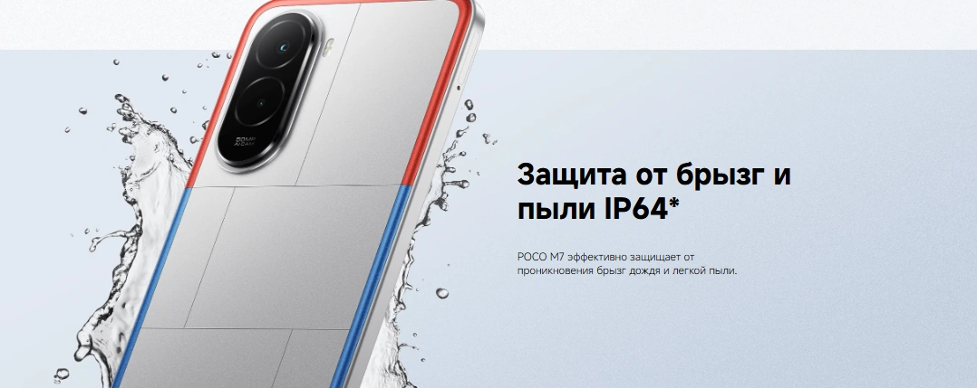 Корпус с четырёхсторонним закруглением удобно лежит в руке, а усиленная конструкция прошла строгие тесты качества. Поддержка NFC, Dolby Atmos, Hi-Res Audio, а также защита IP64 делают POCO M7 универсальным смартфоном для работы и отдыха.