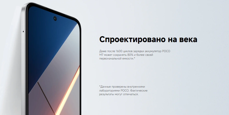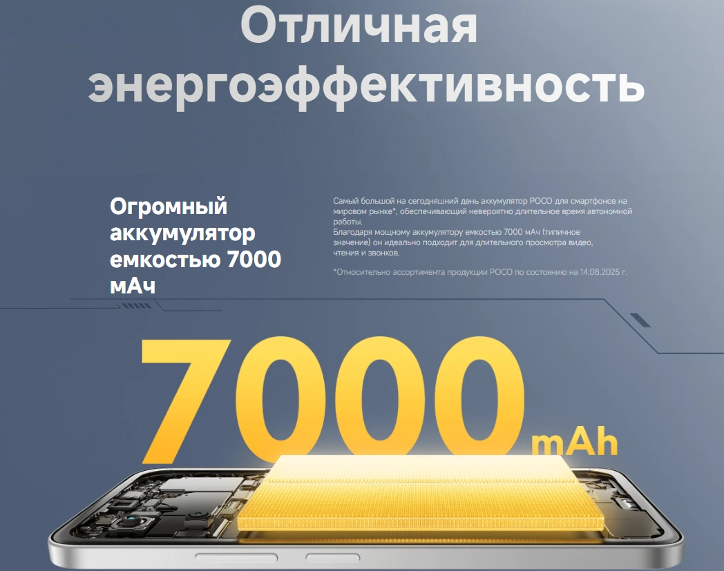 POCO M7 оснащён самым ёмким аккумулятором в линейке POCO для глобального рынка — 7000 мА·ч, что обеспечивает до нескольких дней активного использования без подзарядки. Смартфон идеально подходит для просмотра видео, общения, чтения и развлечений без постоянной зависимости от розетки.
