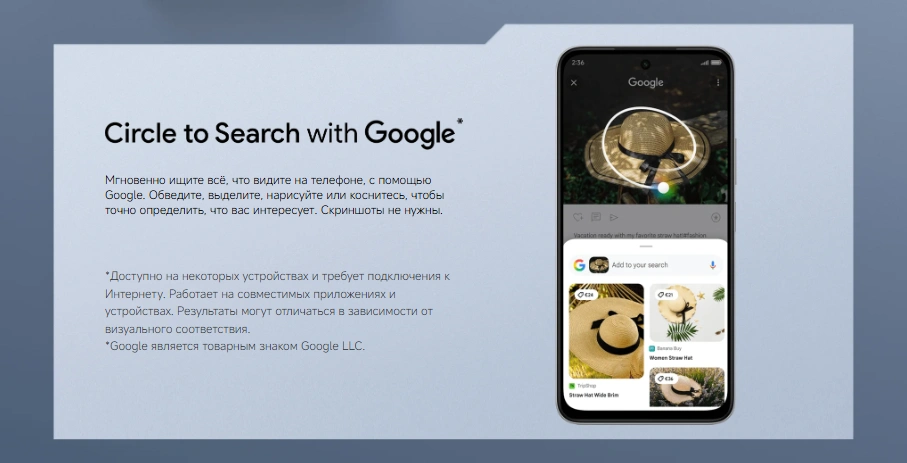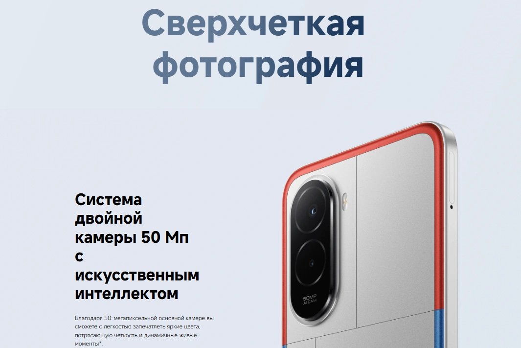 Камера 50 МП с ИИ позволяет делать чёткие снимки днём и ночью, автоматически улучшая кадры. Фронтальная камера 8 МП отлично подходит для видеозвонков и селфи.