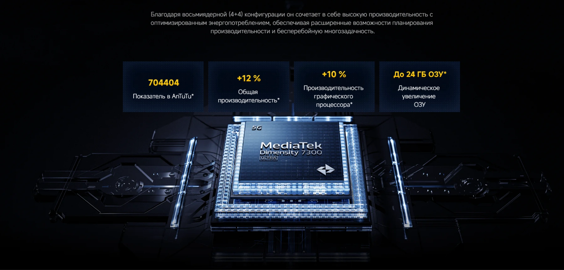 - Мощный процессор Dimensity 7300-Ultra: 8-ядерный процессор с тактовой частотой до 2,5 ГГц и GPU Mali-G615 MC2, обеспечивающий высокую производительность и плавную работу устройства