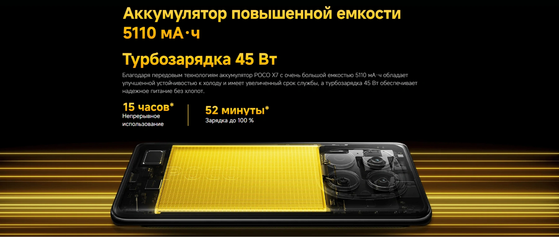- Ёмкий аккумулятор 5110 мАч: Быстрая зарядка мощностью 45 Вт, позволяющая полностью зарядить устройство за короткое время