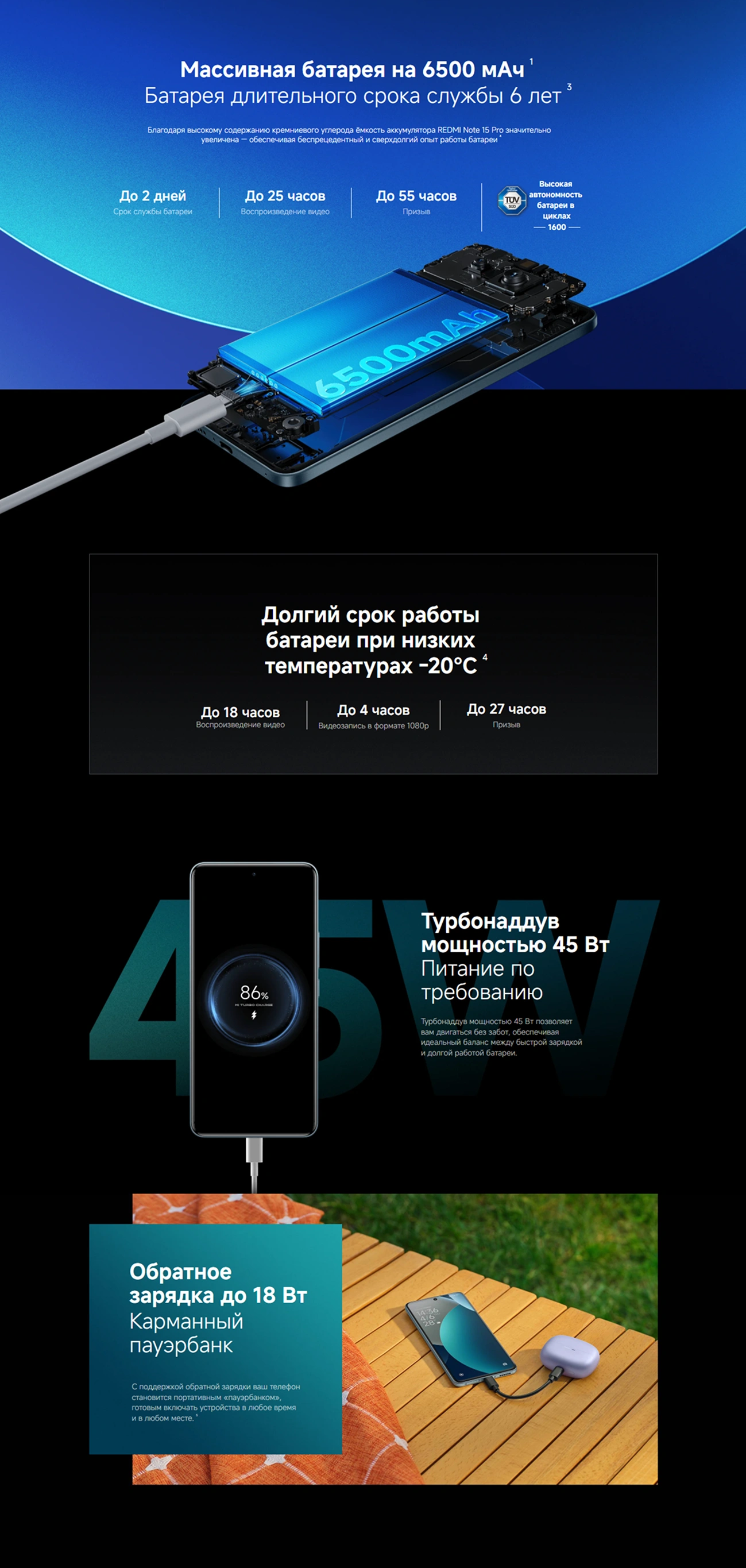 - Аккумулятор 6500 мА·ч — ещё больше автономности, до двух дней активного использования