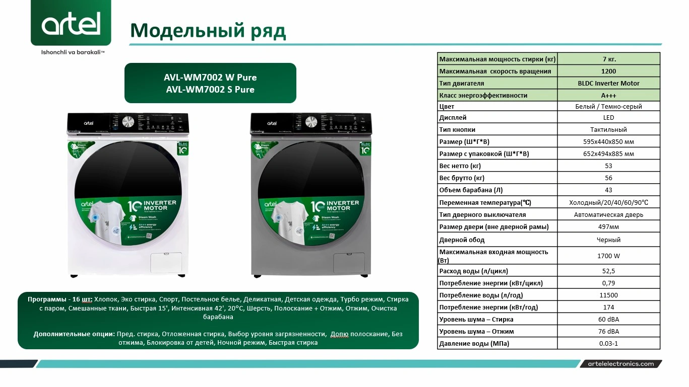 Стиральные машины ARTEL сочетают в себе изысканный дизайн и передовые технологии. Данная стиральная машина относится к классу энергоэффективности А+++. Предназначена для эффективной очистки вещей. В этой модели установлен инновационный BLDC inverter motor. Он рассчитан на длительную эксплуатацию, экономно расходует электроэнергию и работает практически бесшумно.