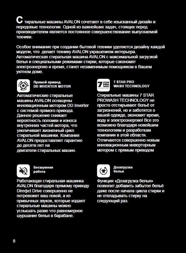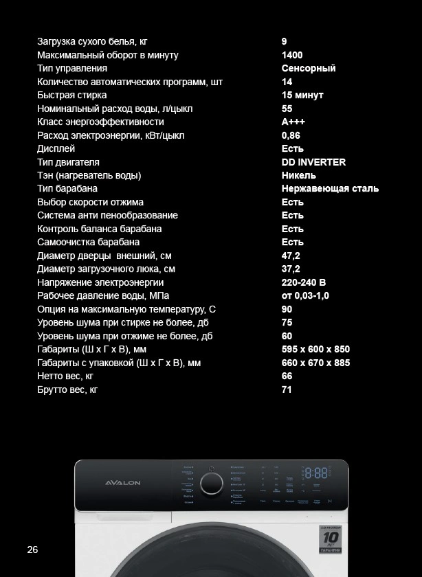 Стиральные машины AVALON сочетают в себе изысканный дизайн и передовые технологии. Данная стиральная машина относится к классу энергоэффективности А+++. Предназначена для эффективной очистки вещей. В этой модели установлен инверторный мотор с прямым приводом. Он рассчитан на длительную эксплуатацию, экономно расходует электроэнергию и работает практически бесшумно.