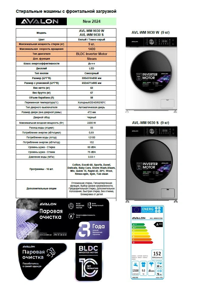 Стиральные машины AVALON сочетают в себе изысканный дизайн и передовые технологии. Данная стиральная машина относится к классу энергоэффективности А+++. Предназначена для эффективной очистки вещей. В этой модели установлен инновационный BLDC inverter motor. Он рассчитан на длительную эксплуатацию, экономно расходует электроэнергию и работает практически бесшумно. Доп. функция - Steam паровой очистка. Анти аллергенный.