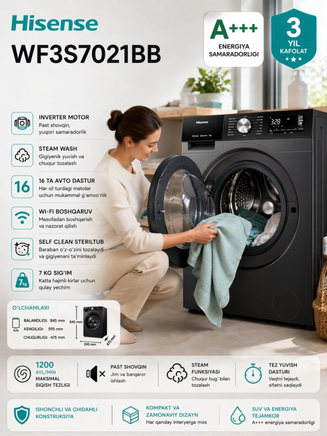 Hisense WF3S7021BB — это высокотехнологичная, экономичная и тихая стиральная машина, которая значительно упрощает повседневную жизнь. Благодаря современному дизайну и интеллектуальным функциям она обеспечивает бережный и эффективный уход за любыми типами тканей.