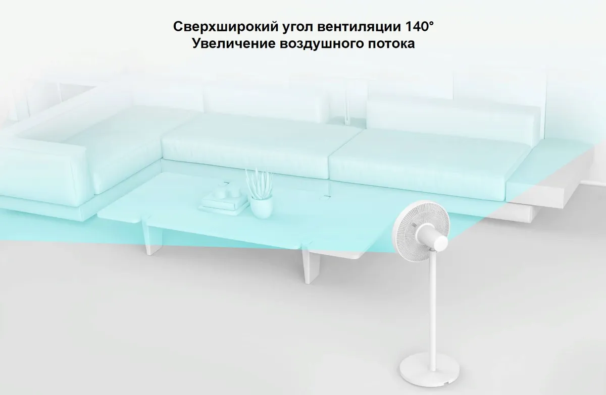 Угол обдуваXiaomi Mi Smart Standing Fan 2 имеет обширный диапазон подачи воздуха. В горизонтальной плоскости его угол обдува равен 140 градусам, а в вертикальной – 39 градусам. Благодаря этому помещение быстрее охлаждается. Максимальная скорость подачи воздуха составляет 20 м³/мин.
