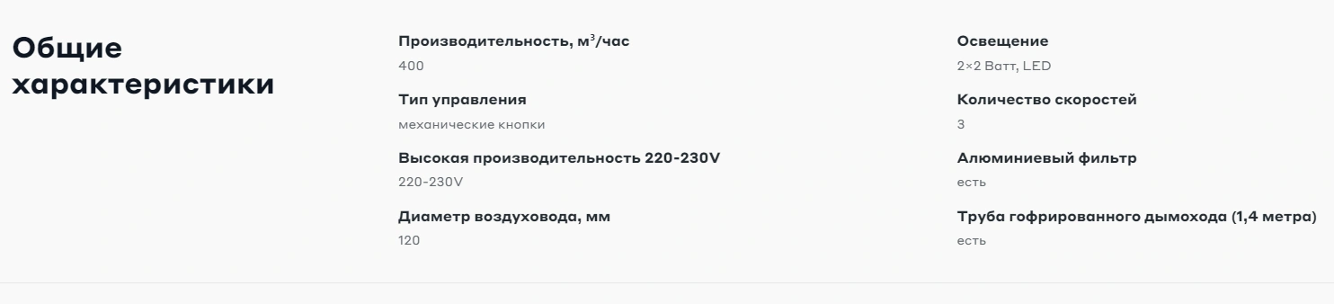 - Производительность: 400 м³/ч для среднего уровня очистки воздуха на кухне.