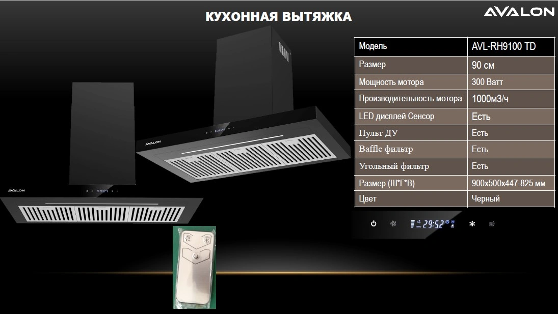 Угольный и алюминиевый фильтры в кухонной вытяжке Avalon AVL-RH9100 качественно очищают воздух на кухне от гари, копоти, неприятных запахов и прочих вредных примесей. Максимальная отметка производительности в ней составляет 1000 кубических метров за один час. Всего разработчики предусмотрели в ней 3 скоростных режима, а управлять ими возможно с помощью простой сенсорной панели и пульта.