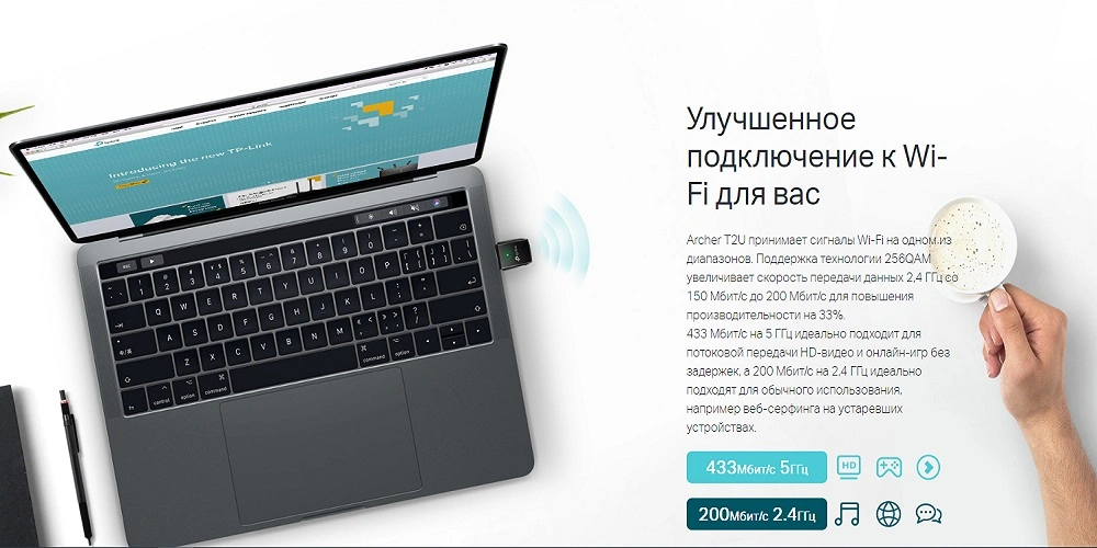 Поддержка беспроводного стандарта AC600 — передача данных на скорости до 200 Мбит/с на 2,4 ГГц и до 433 Мбит/с на 5 ГГц
